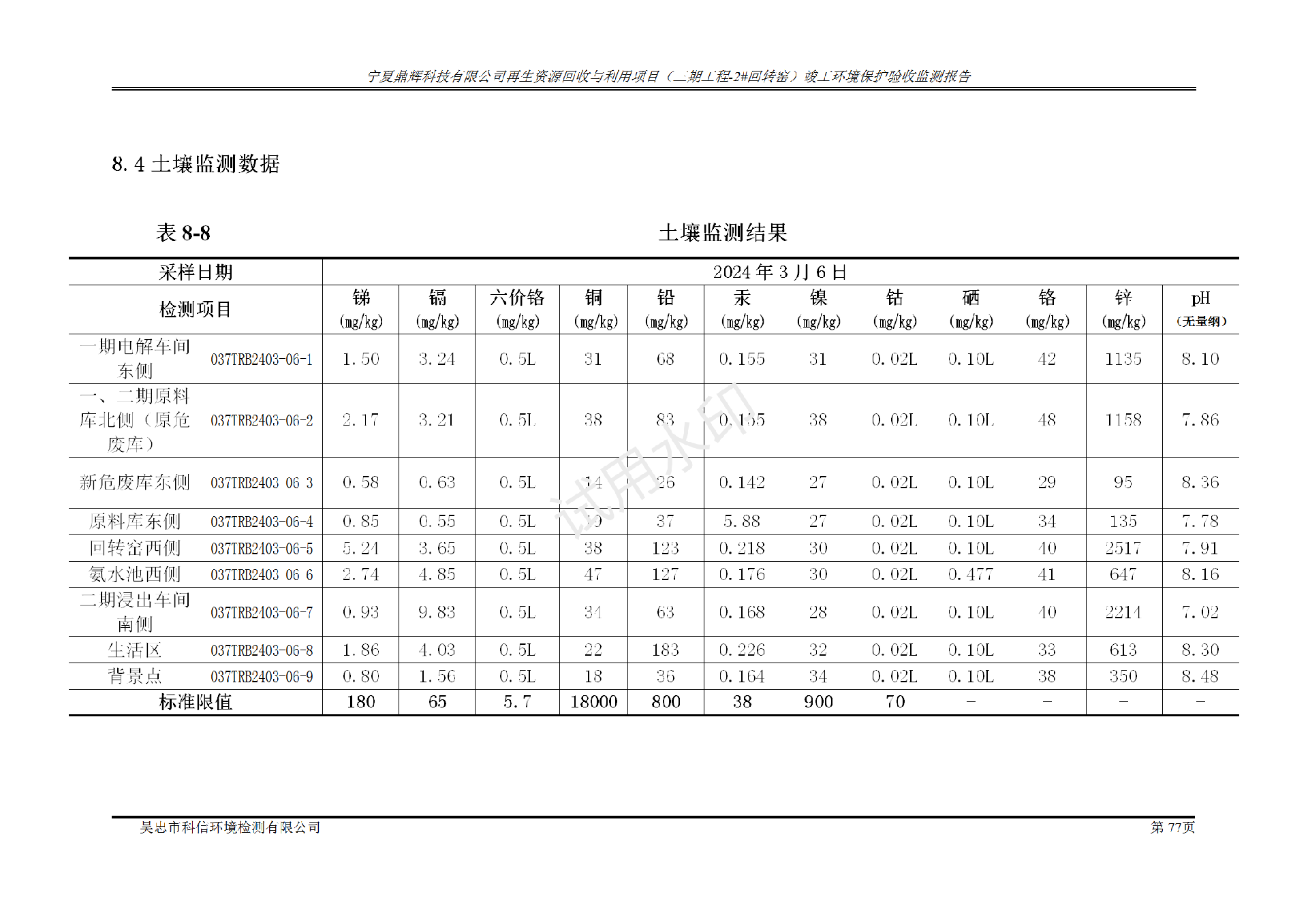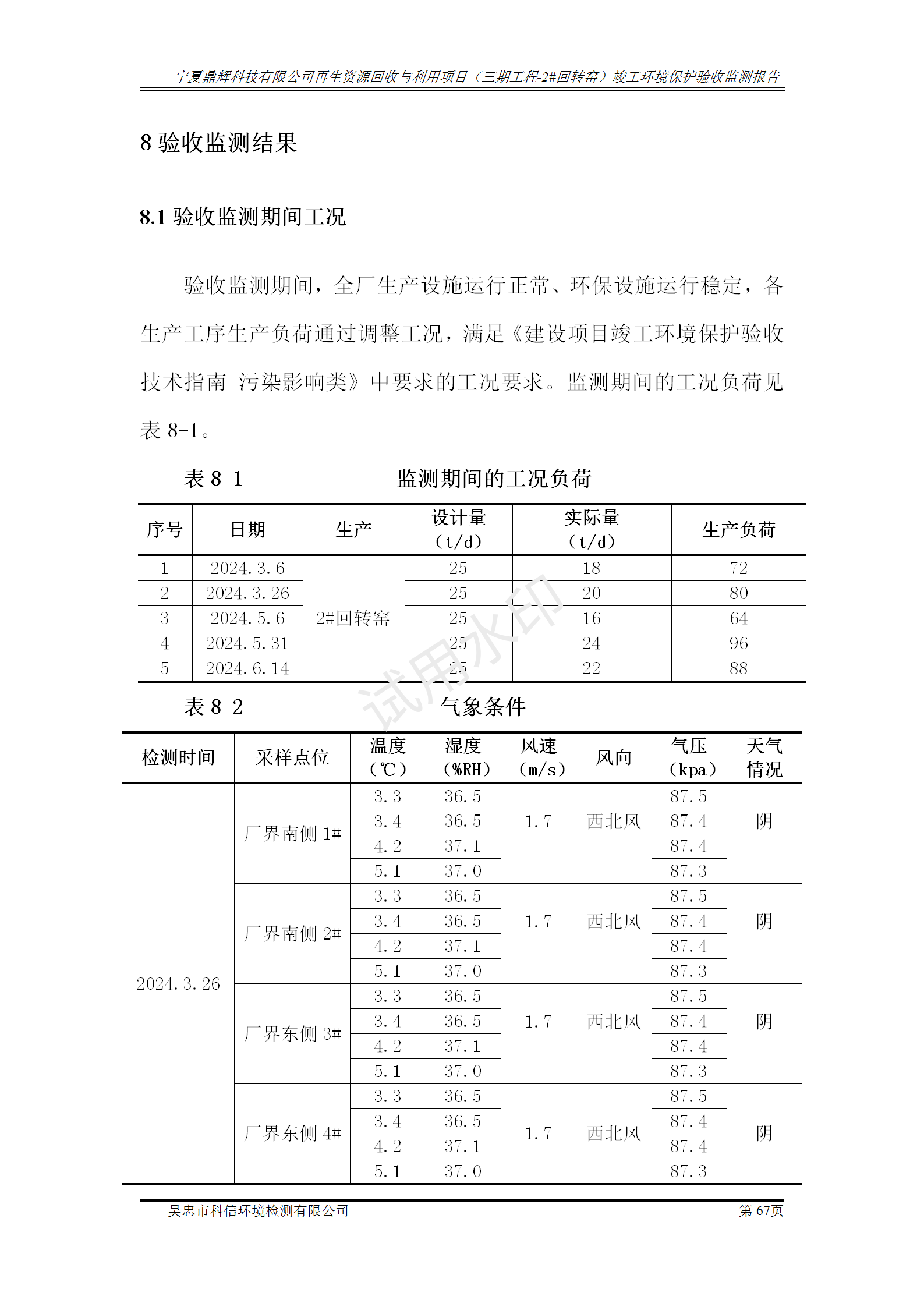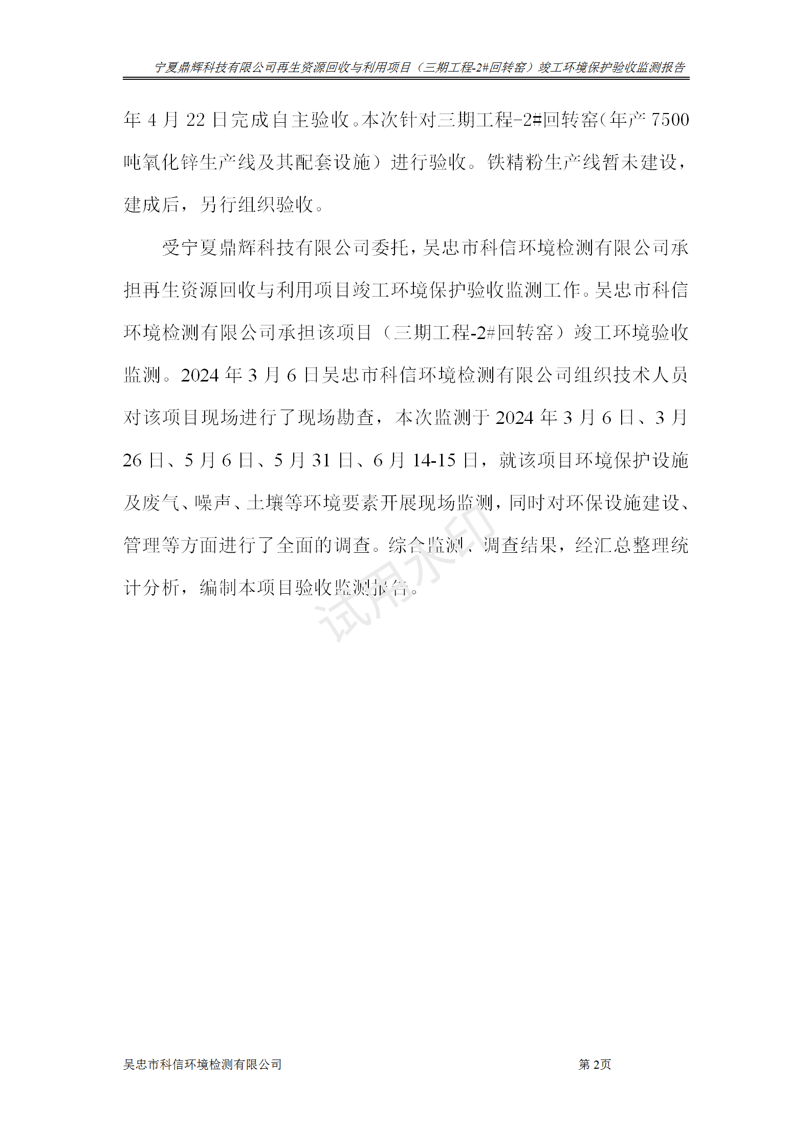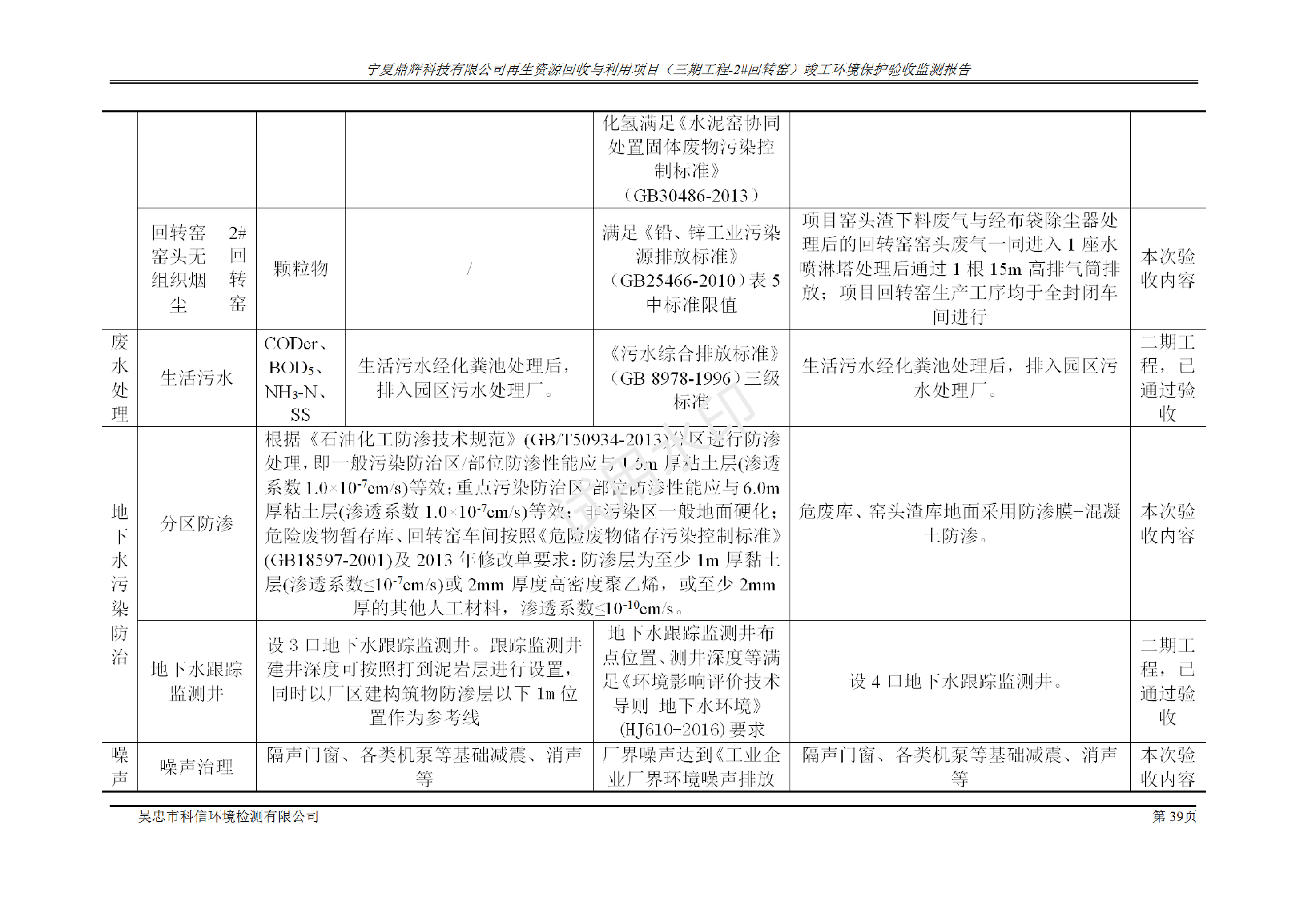 2024年7月5日,寧夏鼎輝科技有限公司(原名青銅峽市鼎輝工貿有限公司)按照環(huán)境保護部《建設項目竣工環(huán)境保護驗收暫行辦法(試行)》(國環(huán)規環(huán)評〔2017〕4號)組織對青銅峽市鼎輝工貿有限公司再生資源回收與利用項目(三期工程-2#回轉窯)進(jìn)行竣工環(huán)境保護驗收。驗收組由項目建設單位(寧夏鼎輝科技有限公司)、驗收監測單位(吳忠市科信環(huán)境檢測有限公司)及特邀3名專(zhuān)家組成。驗收組聽(tīng)取了青銅峽市鼎輝工貿有限公司再生資源回收與利用項目(三期工程-2#回轉窯)建設及環(huán)保設施建設運行情況的匯報,聽(tīng)取了驗收監測單位驗收監測情況的匯報,現場(chǎng)檢查了環(huán)保設施建設運行情況,審查核實(shí)了相關(guān)資料,經(jīng)討論、評議,形成如下驗收意見(jiàn):