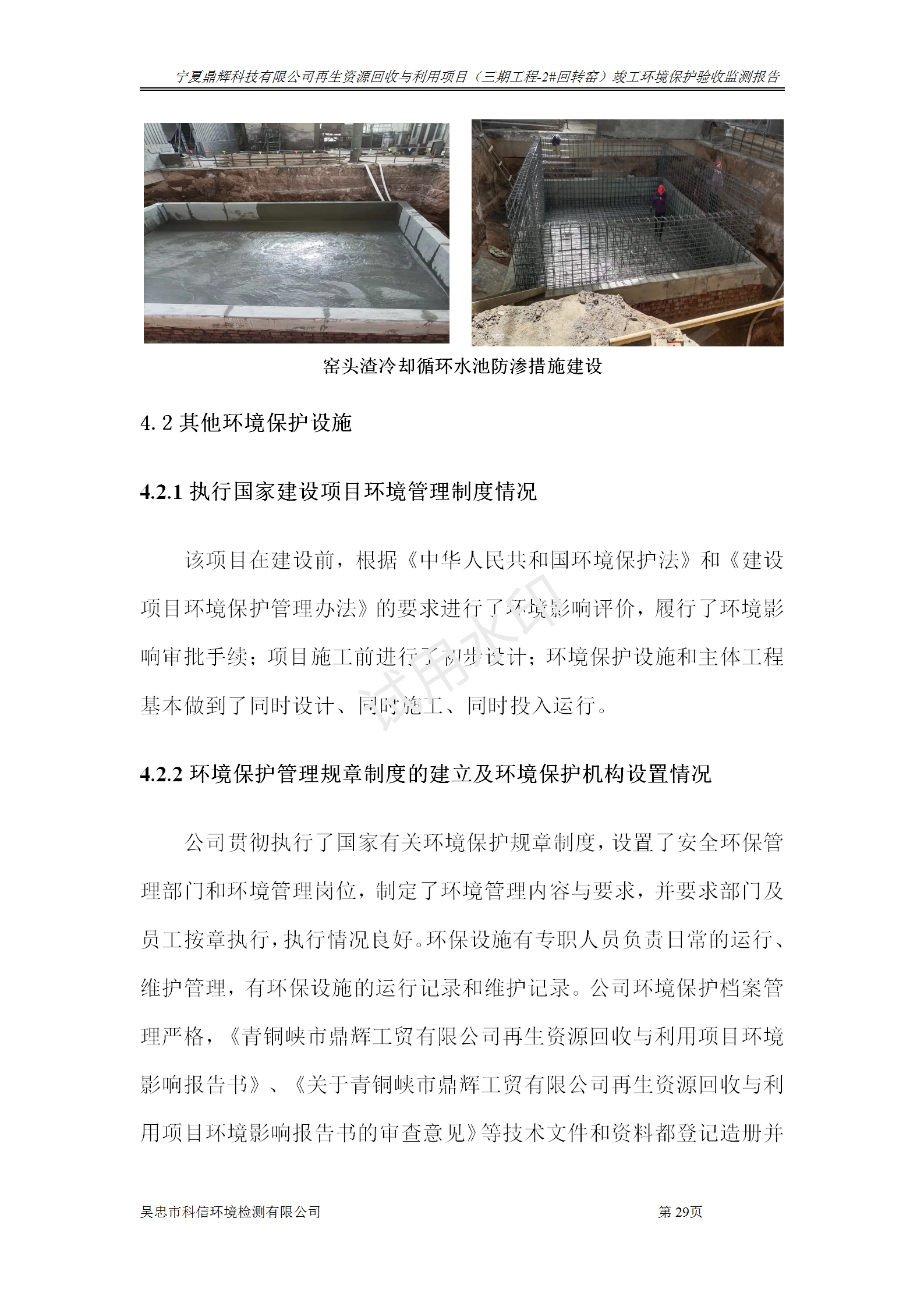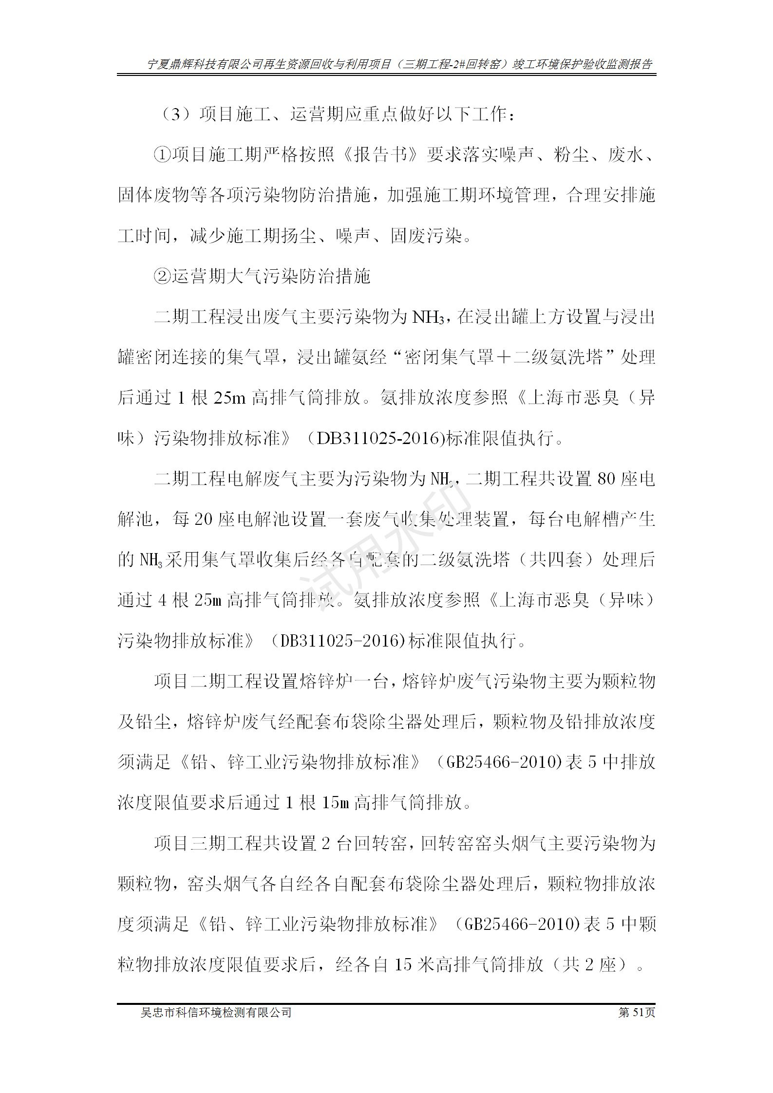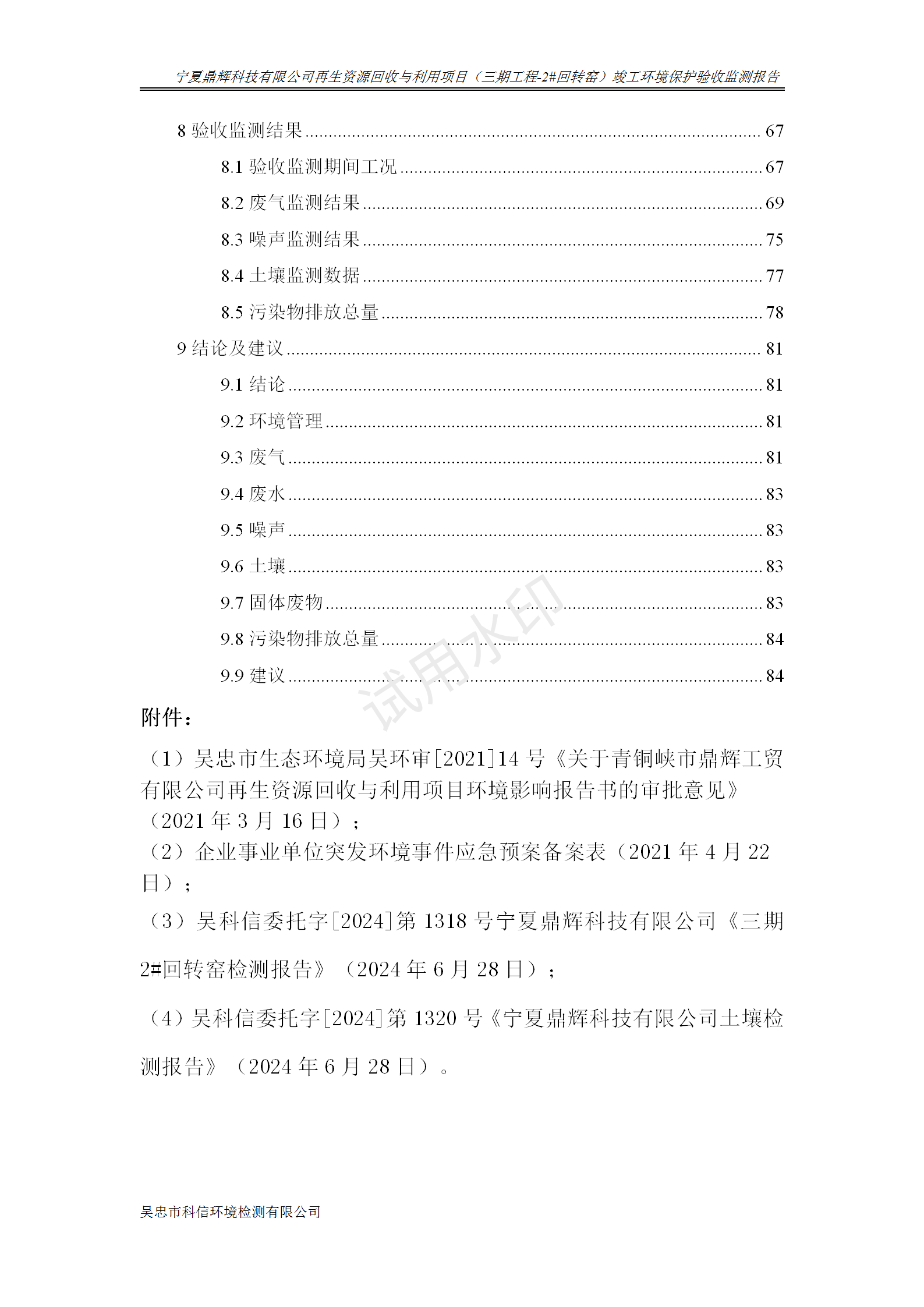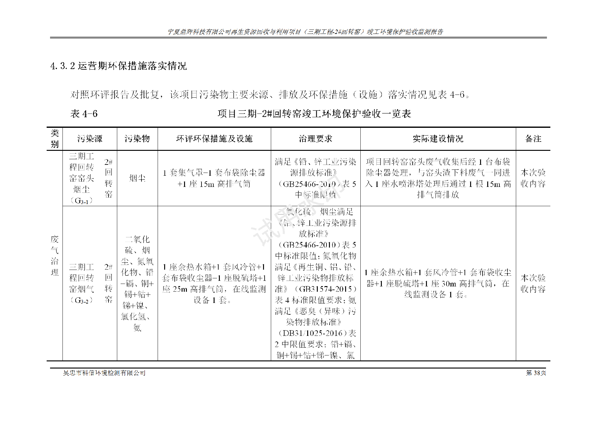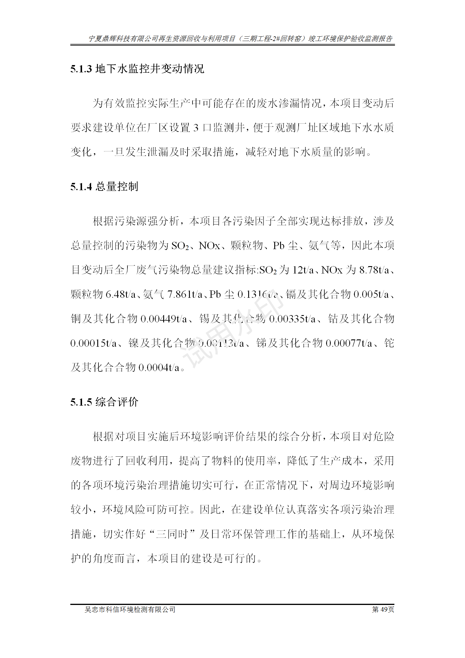 2024年7月5日,寧夏鼎輝科技有限公司(原名青銅峽市鼎輝工貿有限公司)按照環(huán)境保護部《建設項目竣工環(huán)境保護驗收暫行辦法(試行)》(國環(huán)規環(huán)評〔2017〕4號)組織對青銅峽市鼎輝工貿有限公司再生資源回收與利用項目(三期工程-2#回轉窯)進(jìn)行竣工環(huán)境保護驗收。驗收組由項目建設單位(寧夏鼎輝科技有限公司)、驗收監測單位(吳忠市科信環(huán)境檢測有限公司)及特邀3名專(zhuān)家組成。驗收組聽(tīng)取了青銅峽市鼎輝工貿有限公司再生資源回收與利用項目(三期工程-2#回轉窯)建設及環(huán)保設施建設運行情況的匯報,聽(tīng)取了驗收監測單位驗收監測情況的匯報,現場(chǎng)檢查了環(huán)保設施建設運行情況,審查核實(shí)了相關(guān)資料,經(jīng)討論、評議,形成如下驗收意見(jiàn):