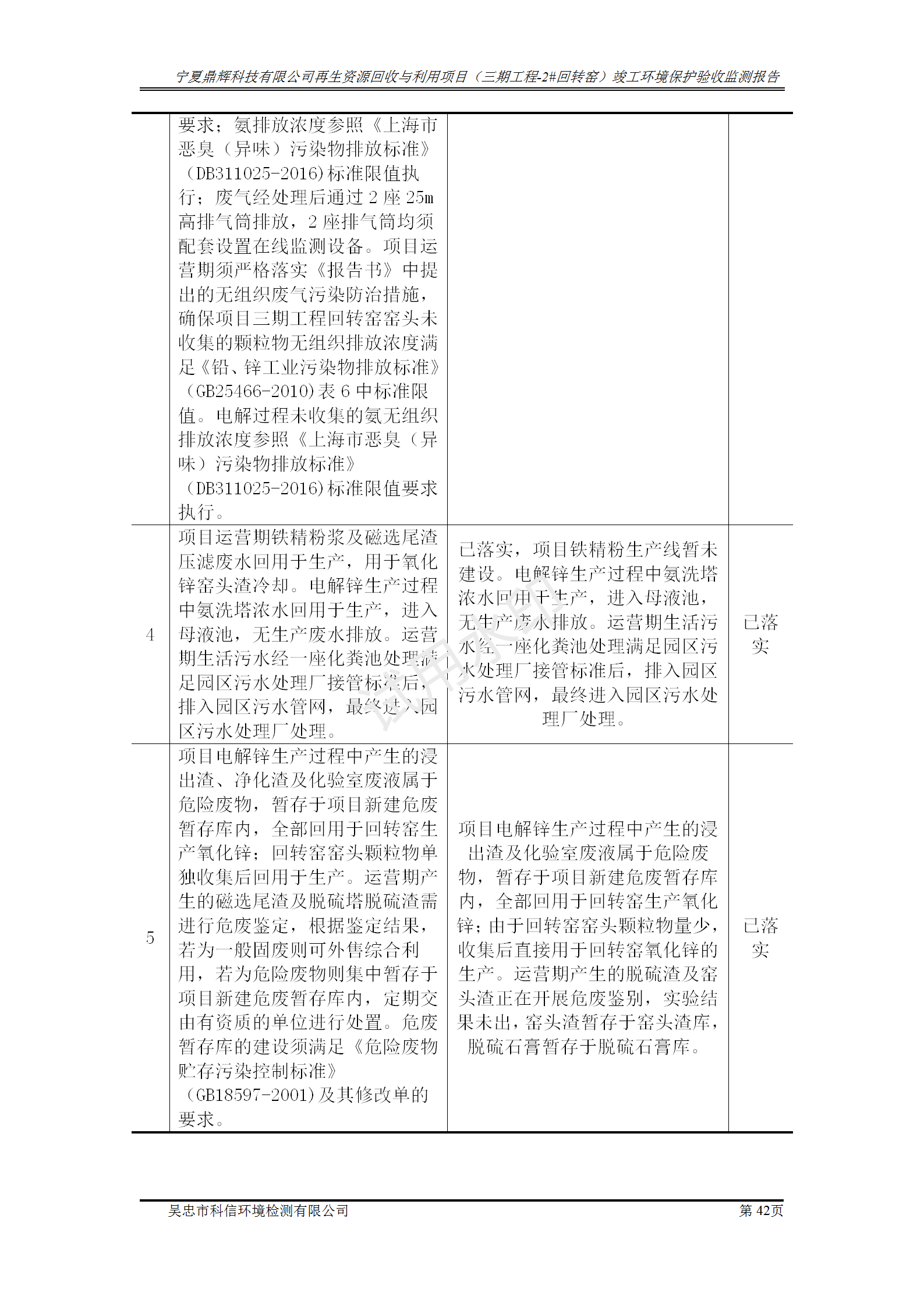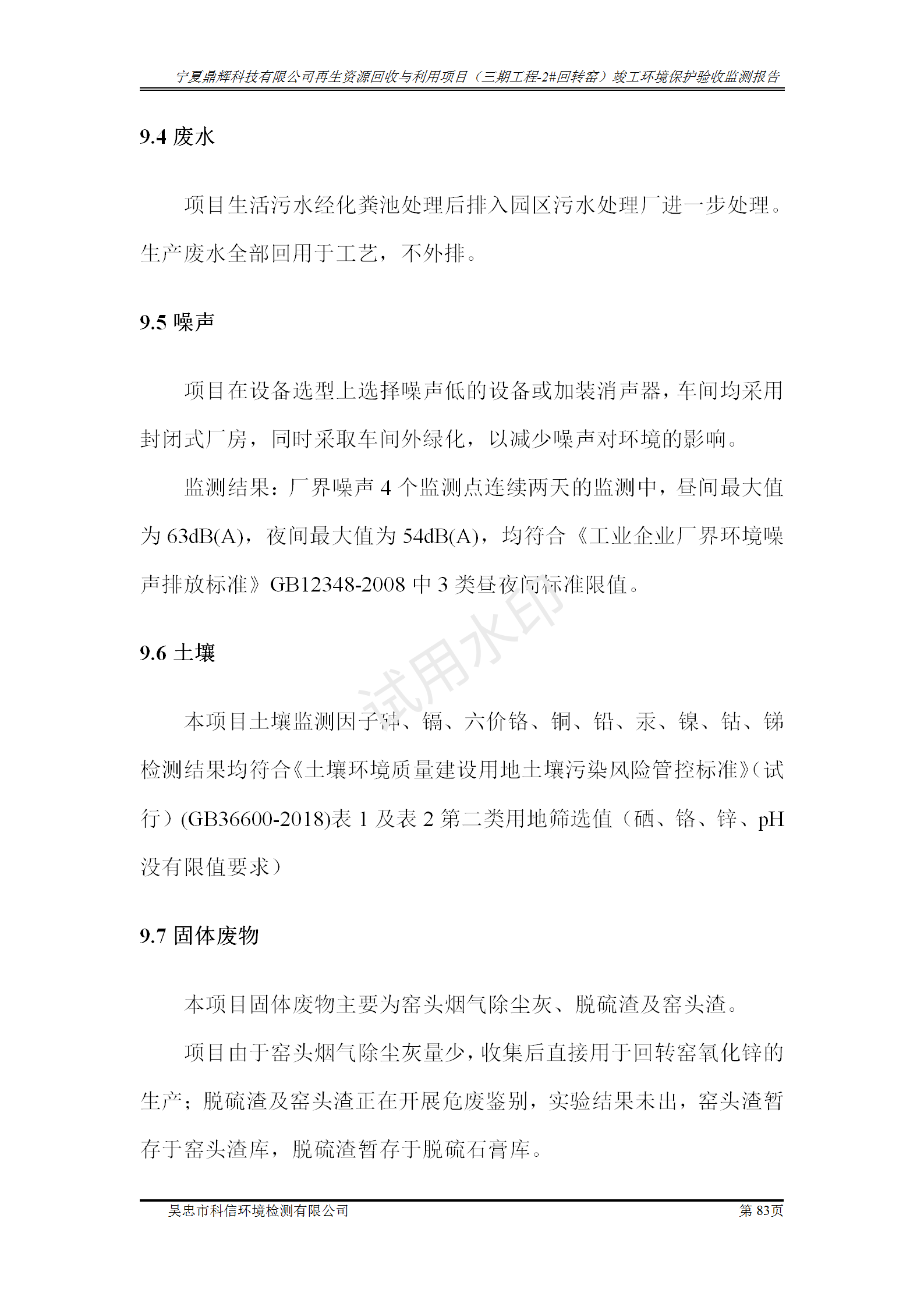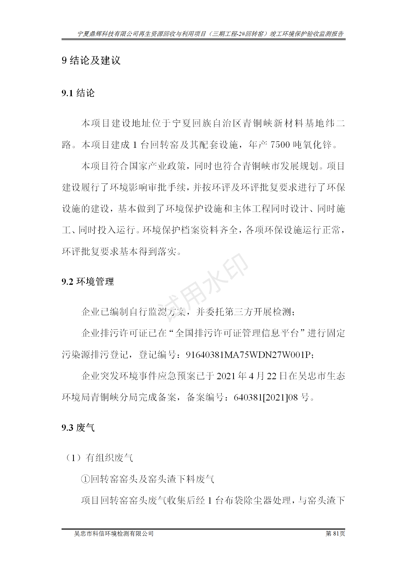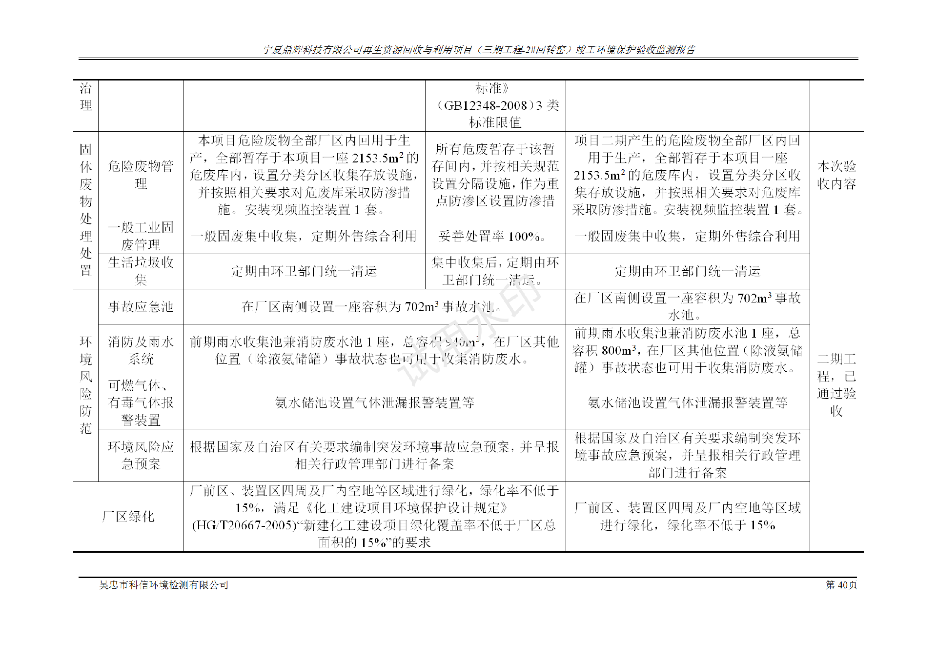 2024年7月5日,寧夏鼎輝科技有限公司(原名青銅峽市鼎輝工貿有限公司)按照環(huán)境保護部《建設項目竣工環(huán)境保護驗收暫行辦法(試行)》(國環(huán)規環(huán)評〔2017〕4號)組織對青銅峽市鼎輝工貿有限公司再生資源回收與利用項目(三期工程-2#回轉窯)進(jìn)行竣工環(huán)境保護驗收。驗收組由項目建設單位(寧夏鼎輝科技有限公司)、驗收監測單位(吳忠市科信環(huán)境檢測有限公司)及特邀3名專(zhuān)家組成。驗收組聽(tīng)取了青銅峽市鼎輝工貿有限公司再生資源回收與利用項目(三期工程-2#回轉窯)建設及環(huán)保設施建設運行情況的匯報,聽(tīng)取了驗收監測單位驗收監測情況的匯報,現場(chǎng)檢查了環(huán)保設施建設運行情況,審查核實(shí)了相關(guān)資料,經(jīng)討論、評議,形成如下驗收意見(jiàn):