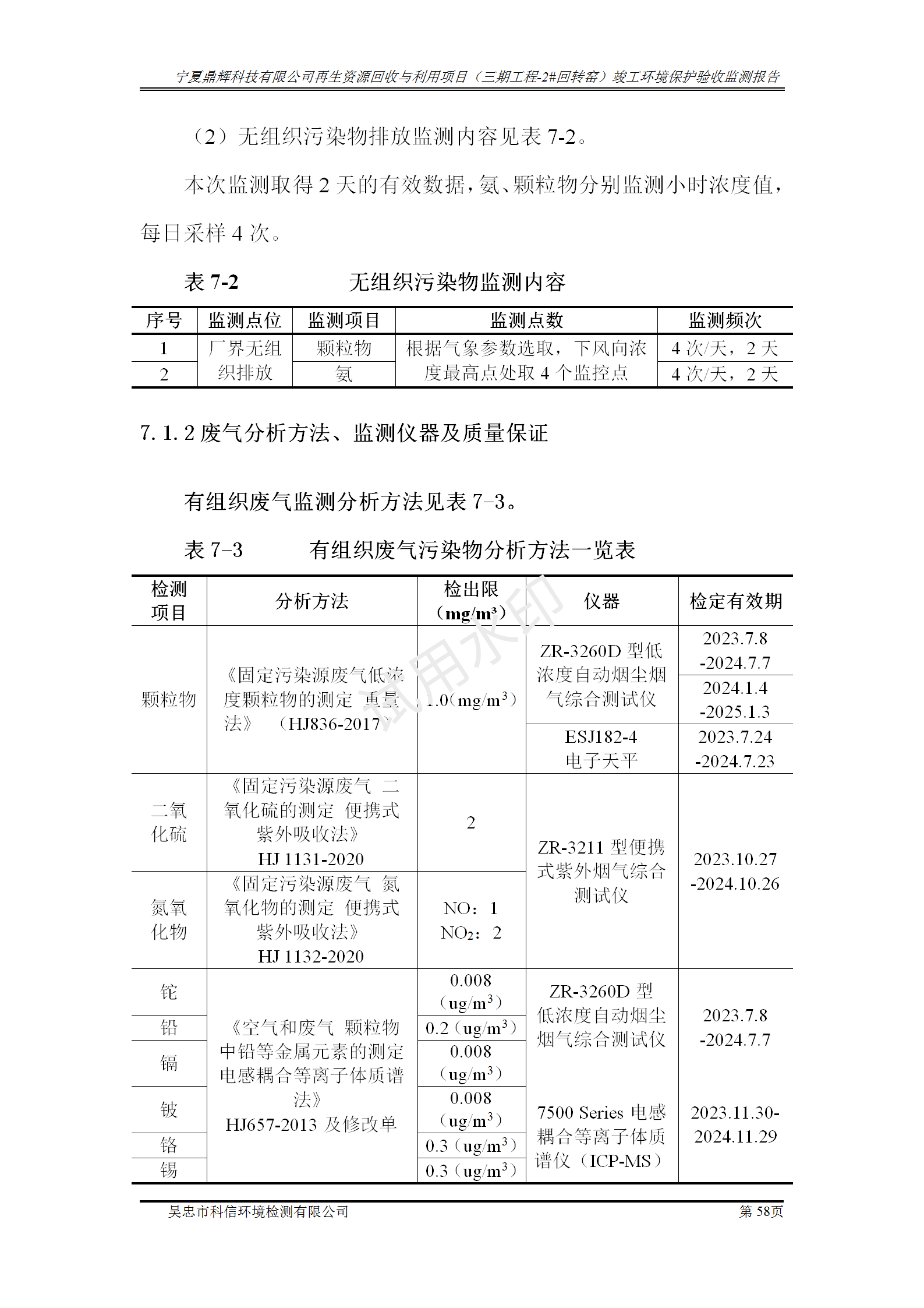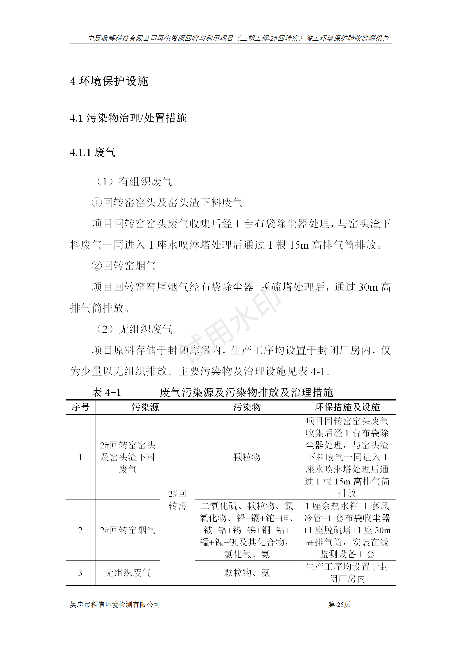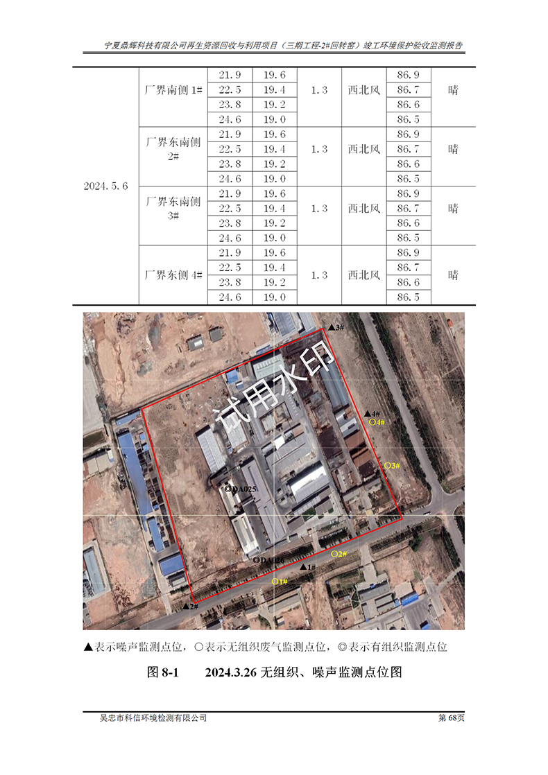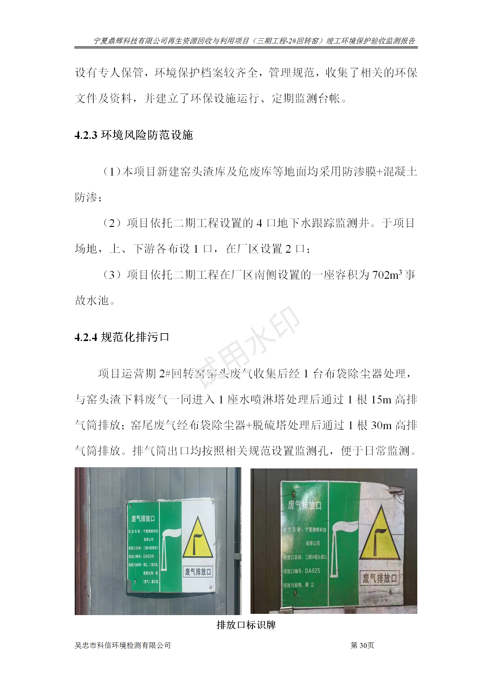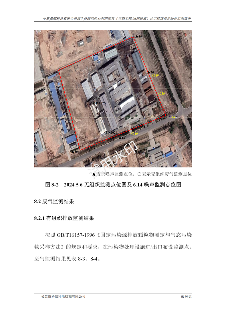 2024年7月5日,寧夏鼎輝科技有限公司(原名青銅峽市鼎輝工貿有限公司)按照環(huán)境保護部《建設項目竣工環(huán)境保護驗收暫行辦法(試行)》(國環(huán)規環(huán)評〔2017〕4號)組織對青銅峽市鼎輝工貿有限公司再生資源回收與利用項目(三期工程-2#回轉窯)進(jìn)行竣工環(huán)境保護驗收。驗收組由項目建設單位(寧夏鼎輝科技有限公司)、驗收監測單位(吳忠市科信環(huán)境檢測有限公司)及特邀3名專(zhuān)家組成。驗收組聽(tīng)取了青銅峽市鼎輝工貿有限公司再生資源回收與利用項目(三期工程-2#回轉窯)建設及環(huán)保設施建設運行情況的匯報,聽(tīng)取了驗收監測單位驗收監測情況的匯報,現場(chǎng)檢查了環(huán)保設施建設運行情況,審查核實(shí)了相關(guān)資料,經(jīng)討論、評議,形成如下驗收意見(jiàn):