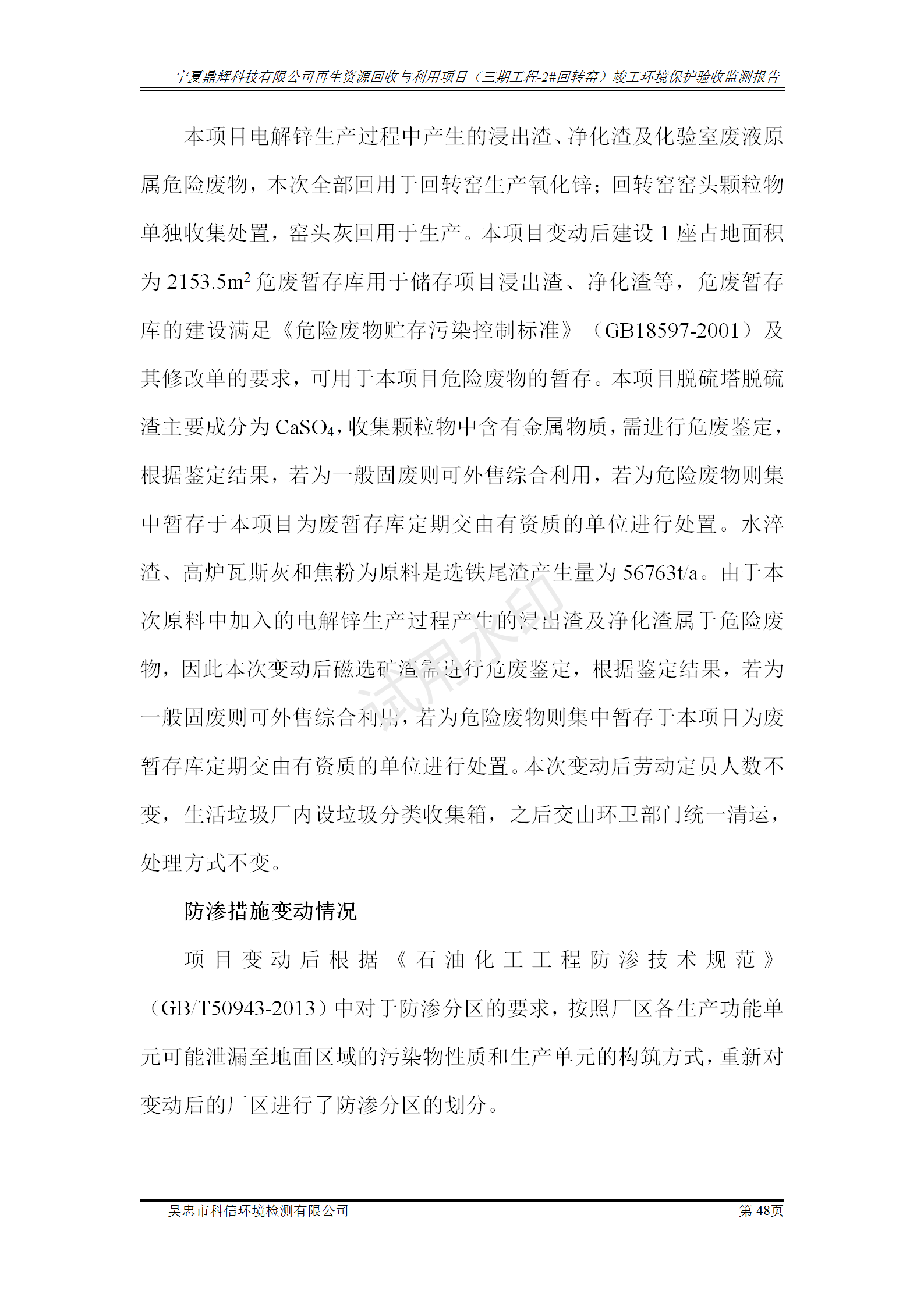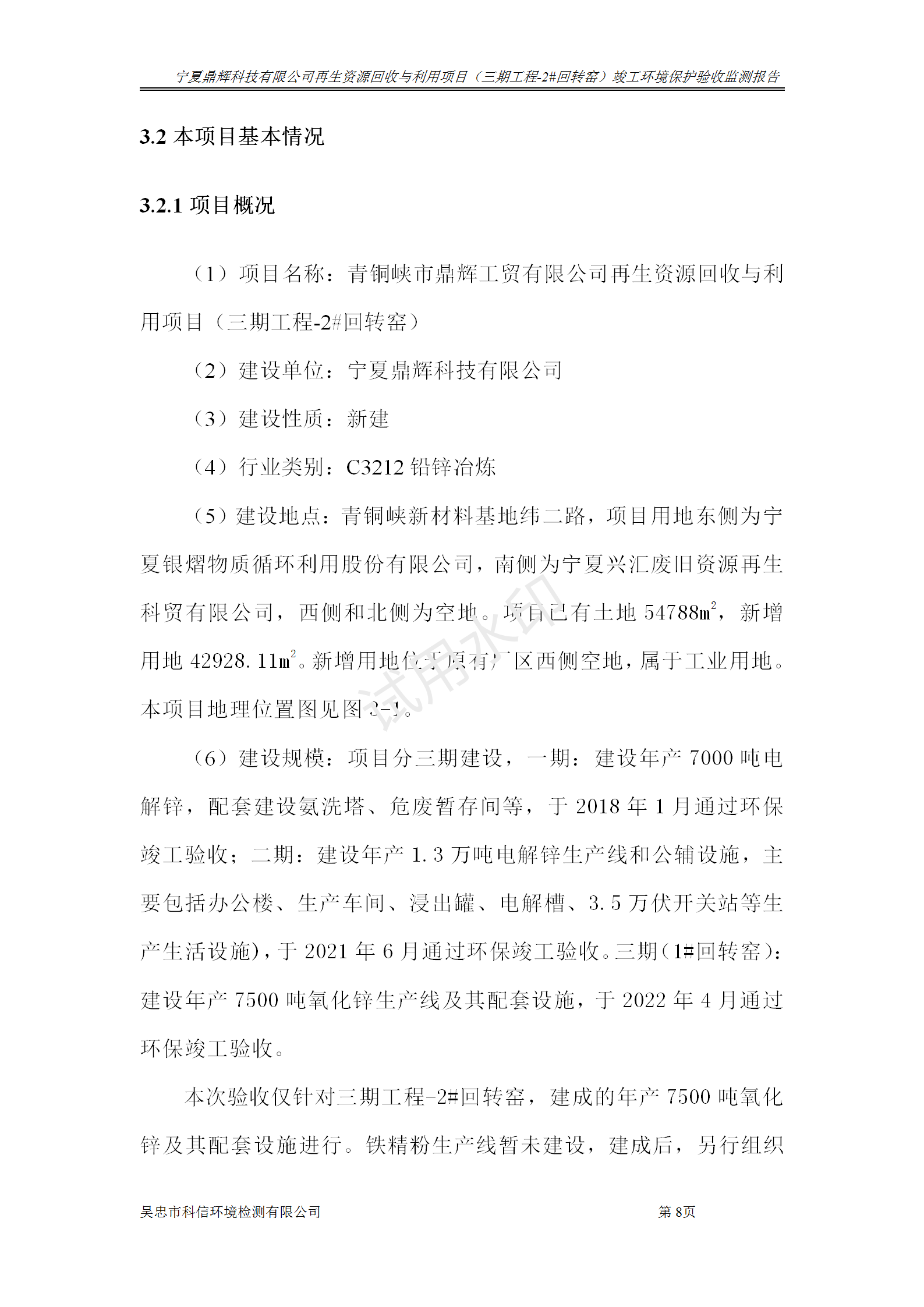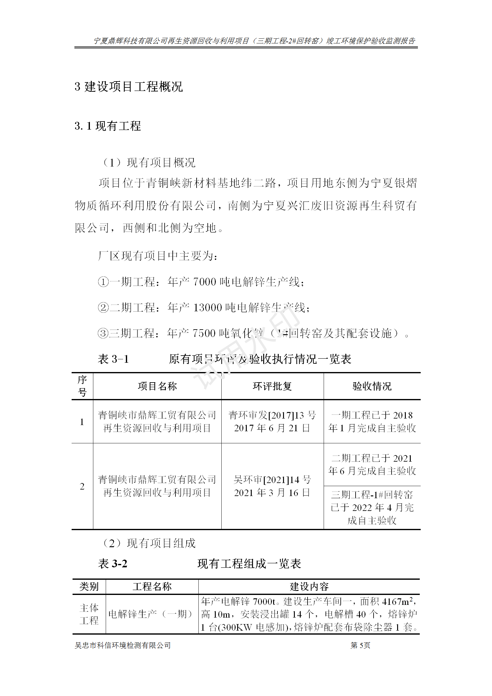 項目分三期建設,一期建設年產(chǎn)7000噸、二期建設年產(chǎn)13000噸、三期建設年產(chǎn)7500噸電解鋅及配套建設氨洗塔、危廢暫存間等,已通過(guò)環(huán)??⒐を炇?。項目在后續建設過(guò)程中,產(chǎn)生的危險廢物處置方式根據項目實(shí)際情況變動(dòng),建設單位對項目浸出渣及凈化渣進(jìn)行回收利用,并對氧化鋅生產(chǎn)設備進(jìn)行調整。相應的生產(chǎn)設施、原輔材料等也需進(jìn)行相應調整,屬于重大變動(dòng)。按照《環(huán)評法》規定需要重新報批環(huán)評。為此,企業(yè)委托寧夏(眾旺達)技術(shù)咨詢(xún)有限公司2021年1月編制完成《青銅峽市鼎輝工貿有限公司再生資源回收與利用項目環(huán)境影響報告書(shū)》,并于2021年3月取得吳忠市生態(tài)環(huán)境局《關(guān)于青銅峽市鼎輝工貿有限公司再生資源回收與利用項目環(huán)境影響報告書(shū)的批復》吳環(huán)審[2021]14號。