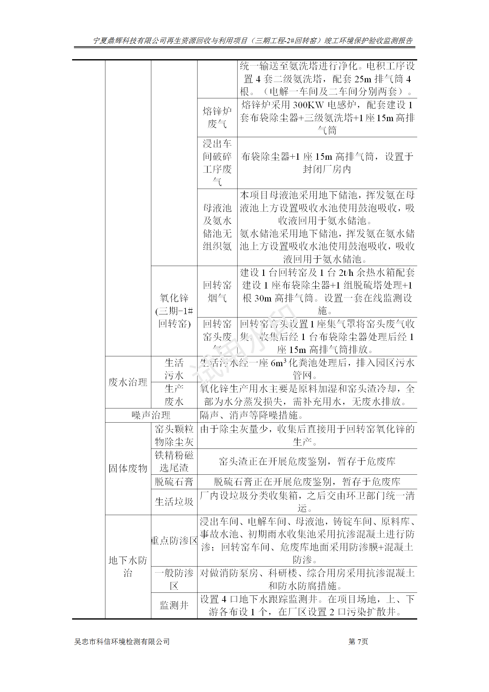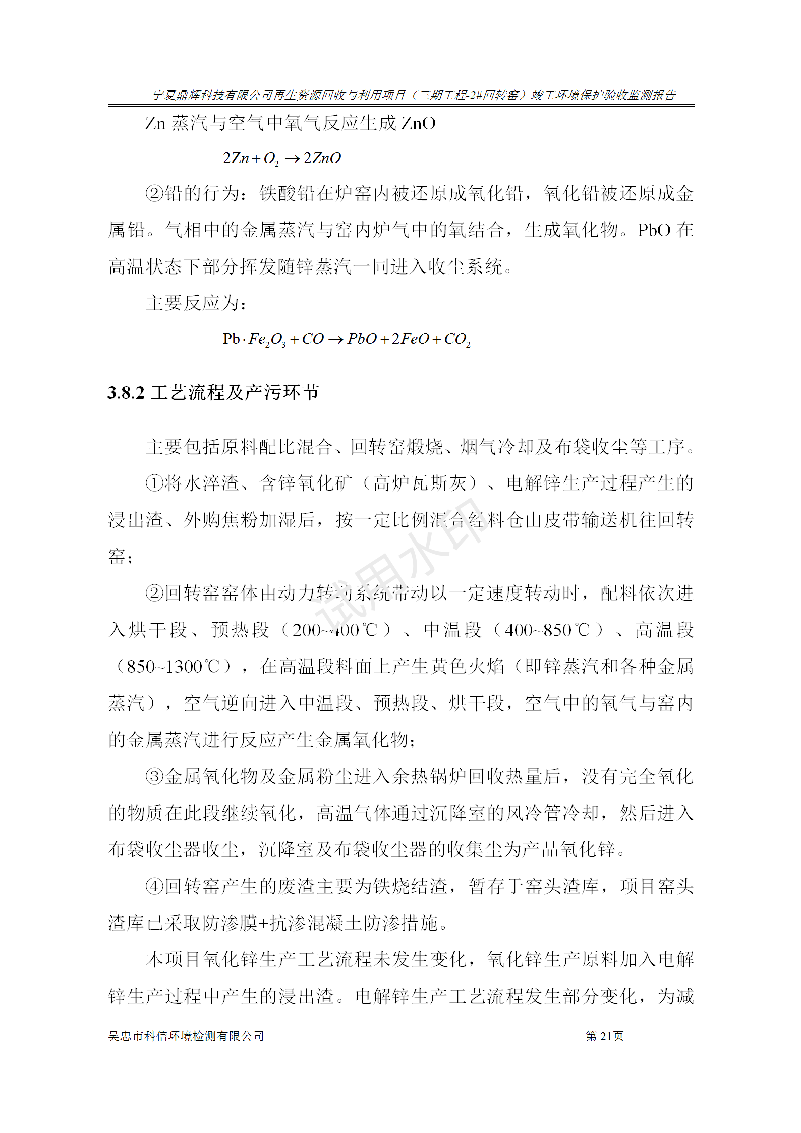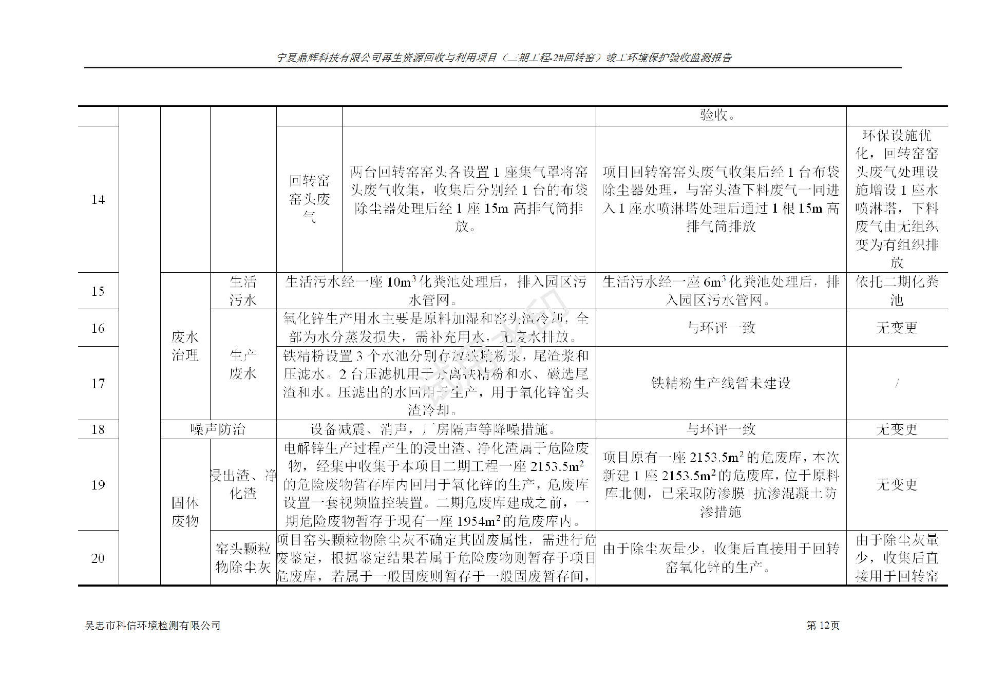 項目分三期建設,一期建設年產(chǎn)7000噸、二期建設年產(chǎn)13000噸、三期建設年產(chǎn)7500噸電解鋅及配套建設氨洗塔、危廢暫存間等,已通過(guò)環(huán)??⒐を炇?。項目在后續建設過(guò)程中,產(chǎn)生的危險廢物處置方式根據項目實(shí)際情況變動(dòng),建設單位對項目浸出渣及凈化渣進(jìn)行回收利用,并對氧化鋅生產(chǎn)設備進(jìn)行調整。相應的生產(chǎn)設施、原輔材料等也需進(jìn)行相應調整,屬于重大變動(dòng)。按照《環(huán)評法》規定需要重新報批環(huán)評。為此,企業(yè)委托寧夏(眾旺達)技術(shù)咨詢(xún)有限公司2021年1月編制完成《青銅峽市鼎輝工貿有限公司再生資源回收與利用項目環(huán)境影響報告書(shū)》,并于2021年3月取得吳忠市生態(tài)環(huán)境局《關(guān)于青銅峽市鼎輝工貿有限公司再生資源回收與利用項目環(huán)境影響報告書(shū)的批復》吳環(huán)審[2021]14號。