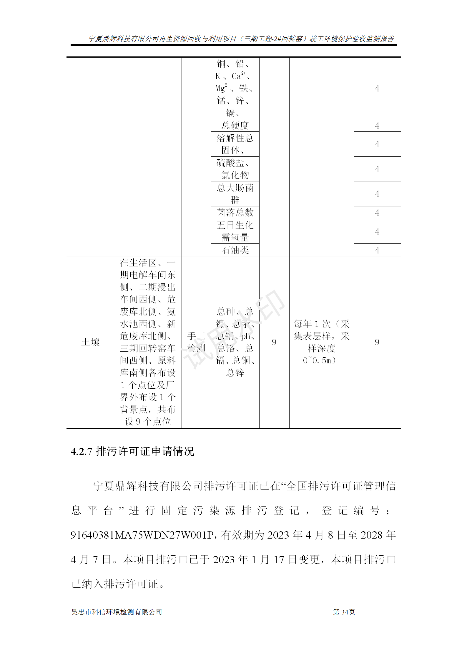 寧夏鼎輝科技有限公司排污許可證已在“全國排污許可證管理信息平臺”進(jìn)行固定污染源排污登記,登記編號:91640381MA75WDN27W001P,有效期為2023年4月8日至2028年4月7日。本項目排污口已于2023年1月17日變更,本項目排污口已納入排污許可證。公司已編制并備案了突發(fā)環(huán)境事件應急預案。環(huán)境管理機構健全,制度完善,企業(yè)制定了自行監測方案并委托第三方開(kāi)展自行監測。