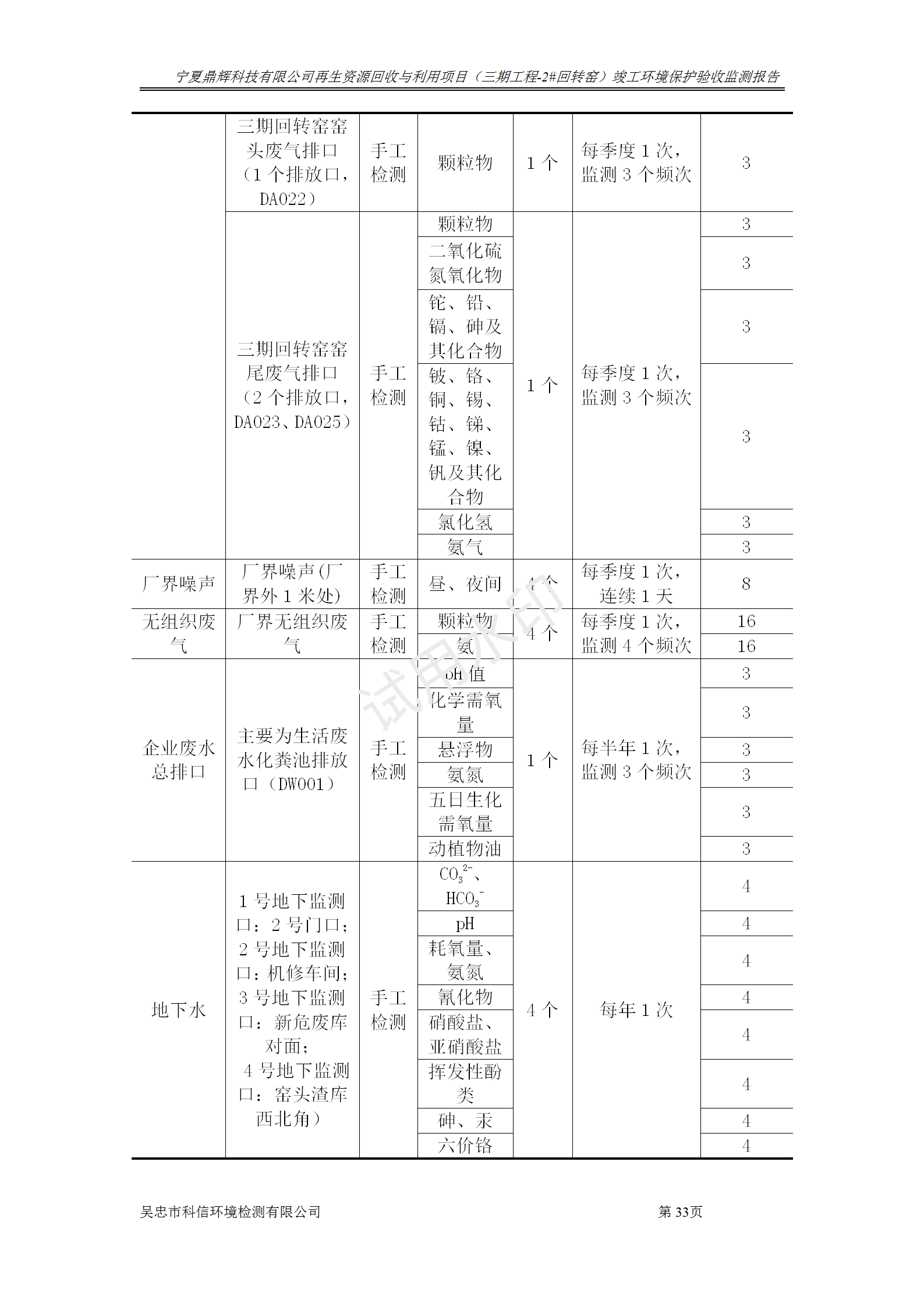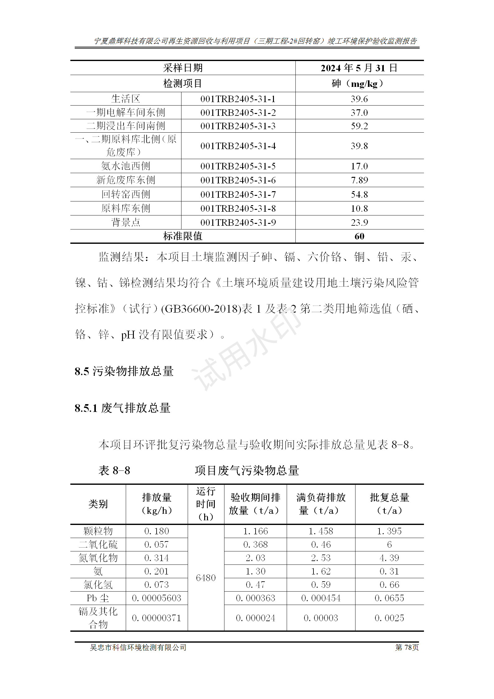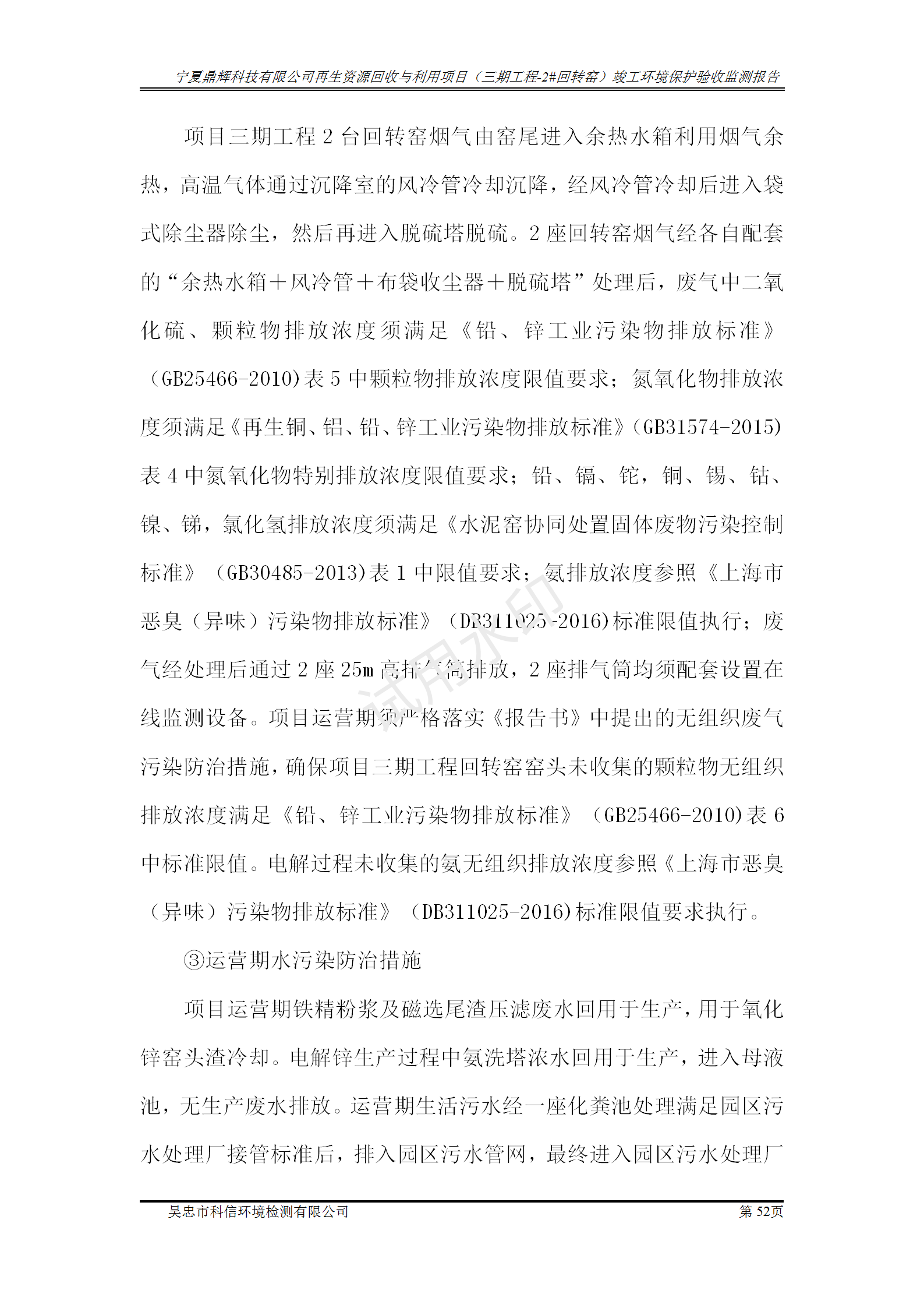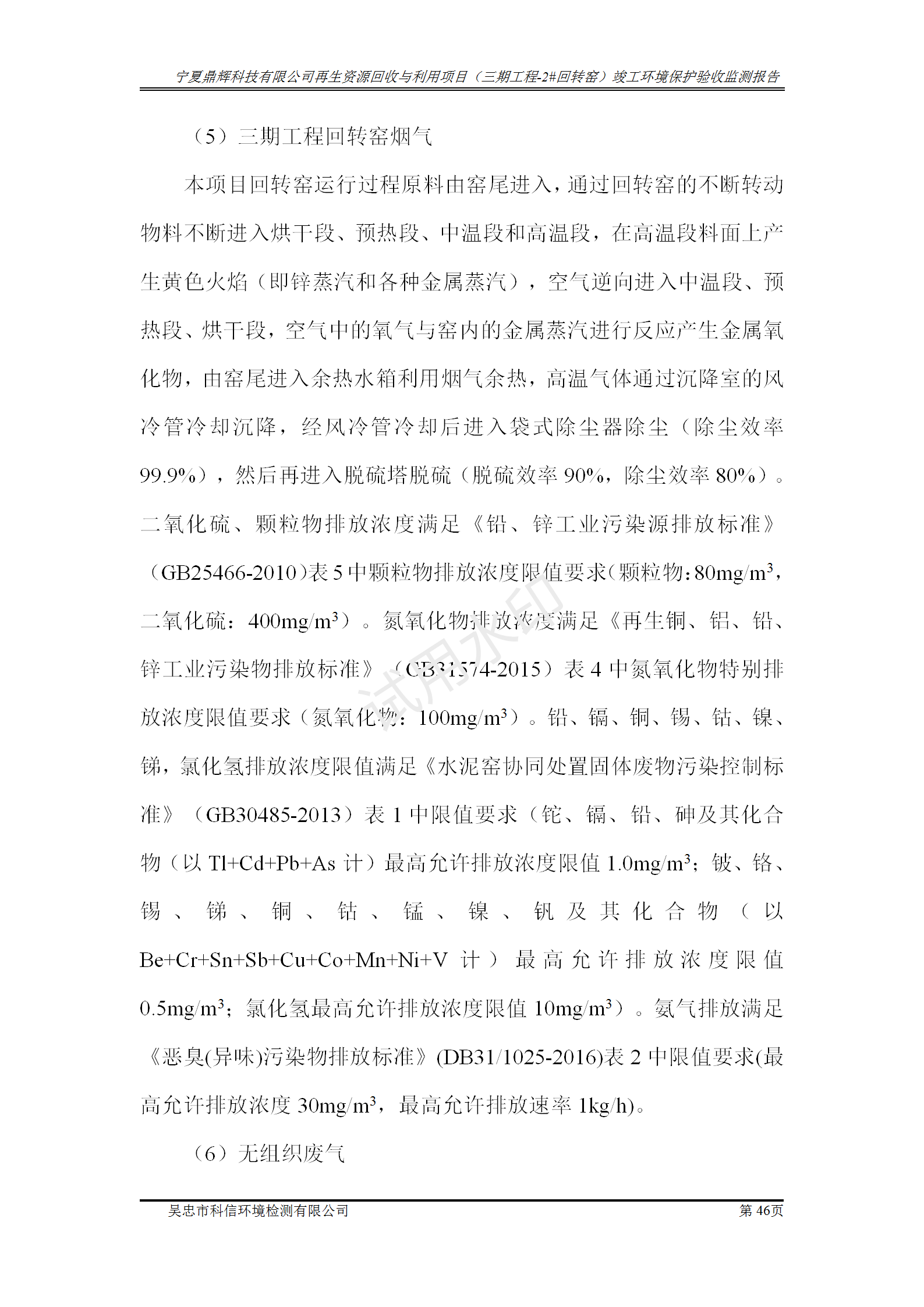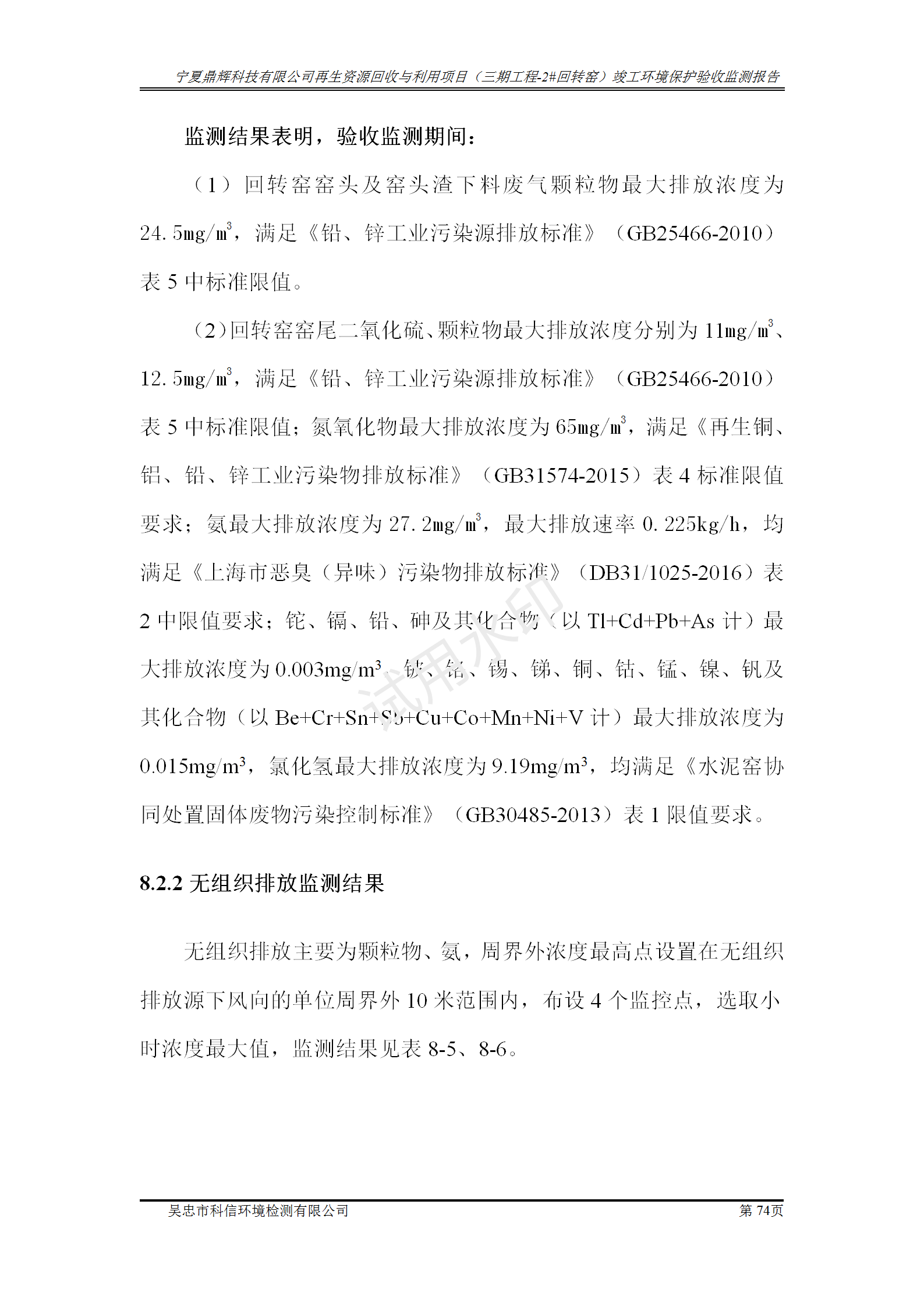 2、回轉窯窯尾二氧化硫、顆粒物*大排放濃度分別為11mg/m3、12.5mg/m3,滿(mǎn)足《鉛、鋅工業(yè)污染源排放標準》(GB25466-2010)表5中標準限值;氮氧化物*大排放濃度為65mg/m3,滿(mǎn)足《再生銅、鋁、鉛、鋅工業(yè)污染物排放標準》(GB31574-2015)表4標準限值要求;氨*大排放濃度為27.2mg/m3,*大排放速率0.225kg/h,均滿(mǎn)足《上海市惡臭(異味)污染物排放標準》(DB31/1025-2016)表2中限值要求;鉈、鎘、鉛、砷及其化合物(以Tl+Cd+Pb+As計)*大排放濃度為0.003mg/m3,鈹、鉻、錫、銻、銅、鈷、錳、鎳、釩及其化合物(以Be+Cr+Sn+Sb+Cu+Co+Mn+Ni+V計)*大排放濃度為0.015mg/m3,氯化氫*大排放濃度為9.19mg/m3,均滿(mǎn)足《水泥窯協(xié)同處置固體廢物污染控制標準》(GB30485-2013)表1限值要求。