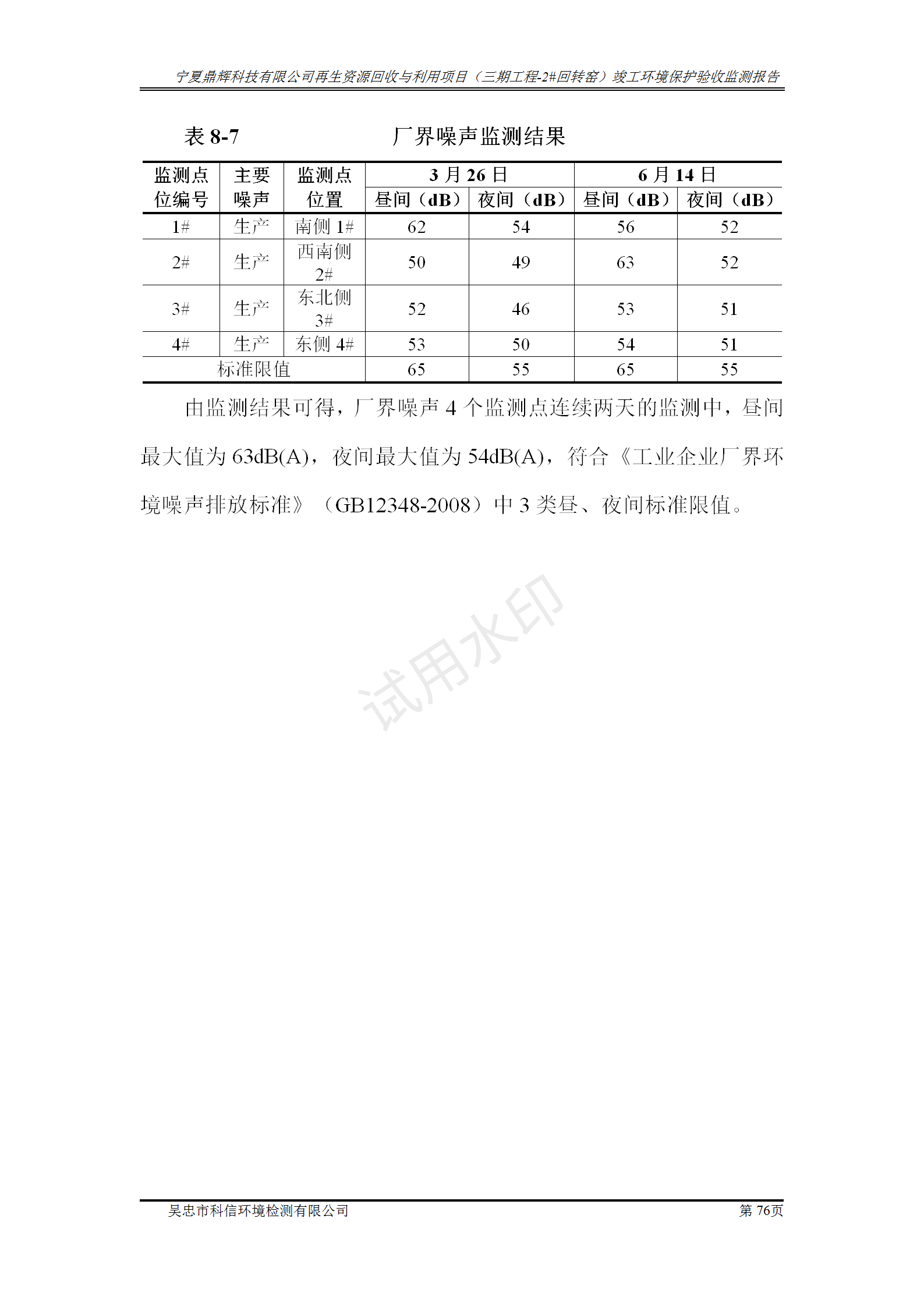 經(jīng)驗收監測:廠(chǎng)界噪聲4個(gè)監測點(diǎn)連續兩天的監測中,晝間*大值為63dB(A),夜間*大值為54dB(A),均符合《工業(yè)企業(yè)廠(chǎng)界環(huán)境噪聲排放標準》GB12348-2008中3類(lèi)晝夜間標準限值。