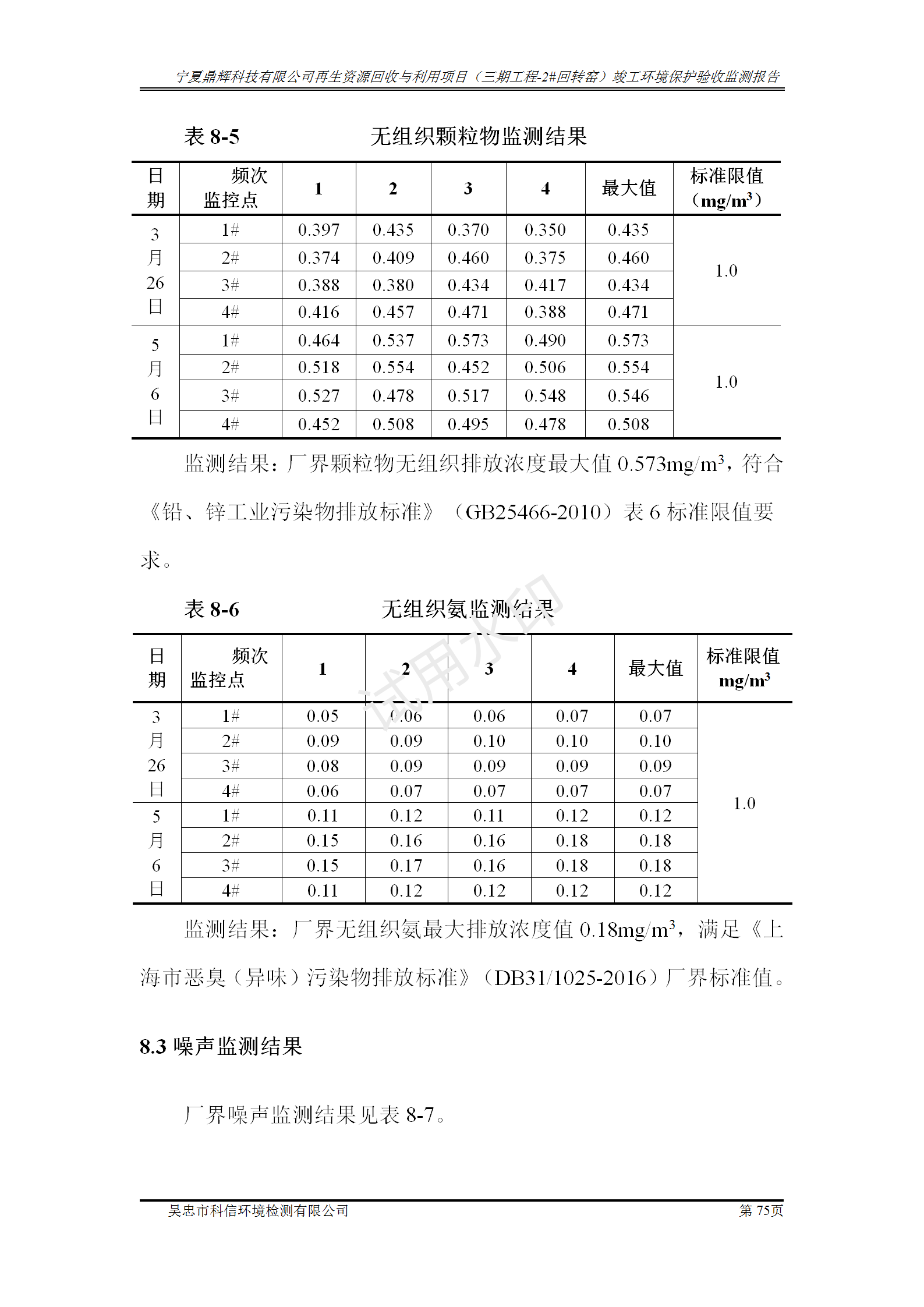3、廠(chǎng)界顆粒物無(wú)組織排放濃度*大值0.573mg/m3,符合《鉛、鋅工業(yè)污染物排放標準》(GB25466-2010)表6標準限值要求;廠(chǎng)界無(wú)組織氨*大排放濃度值0.18mg/m3,滿(mǎn)足《上海市惡臭(異味)污染物排放標準》(DB31/1025-2016)廠(chǎng)界標準值。