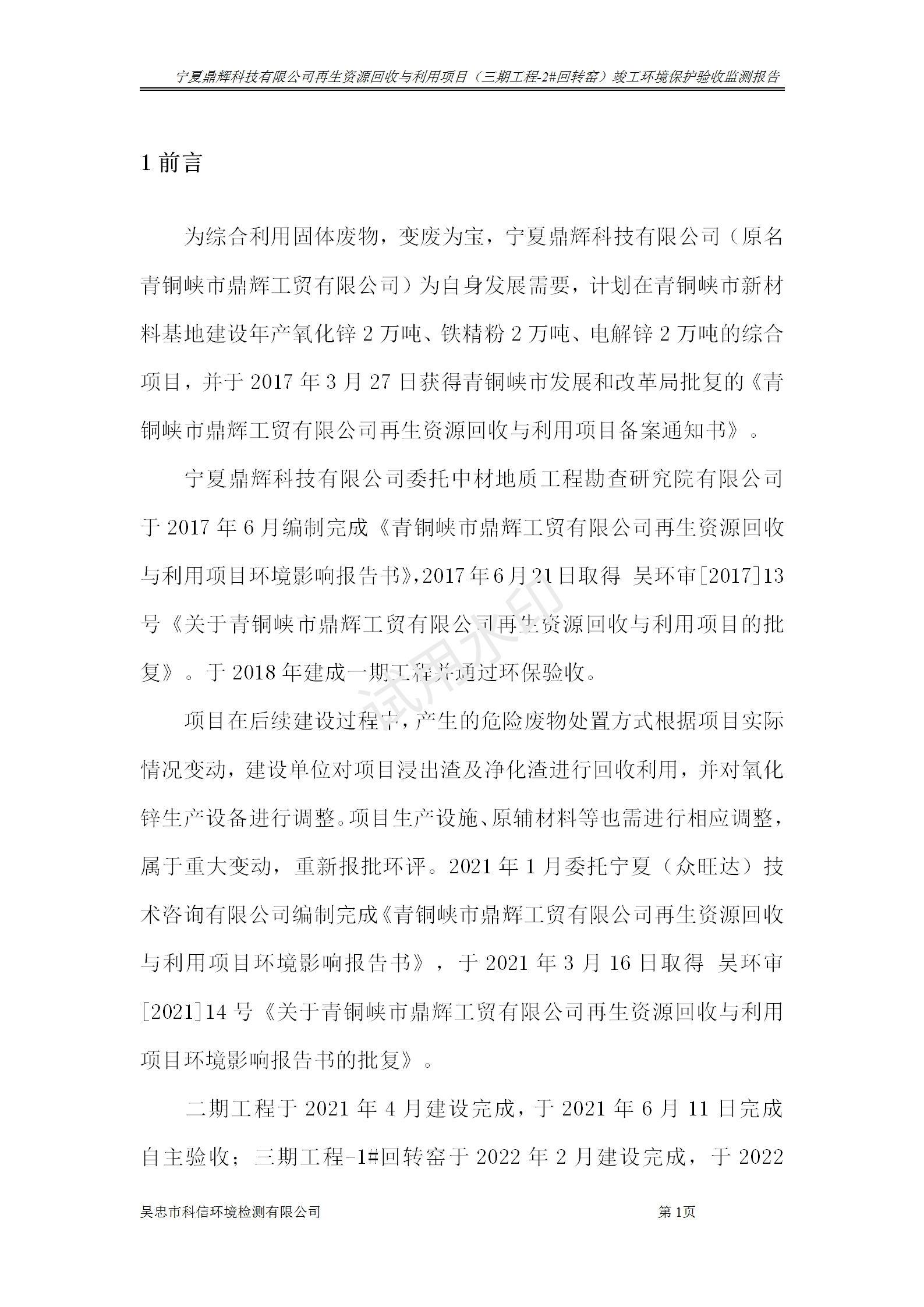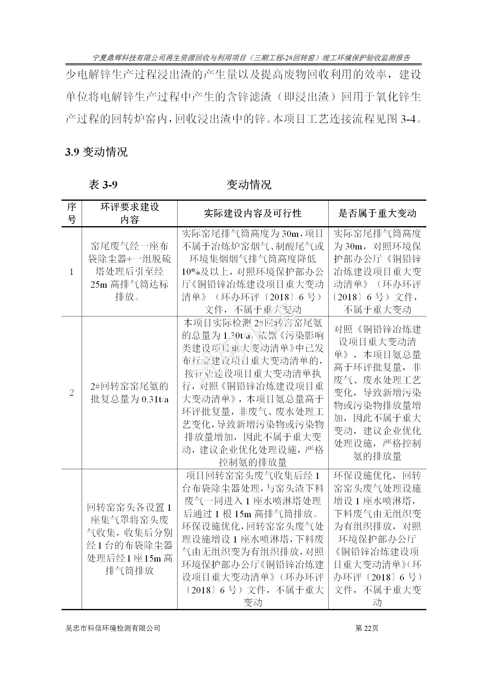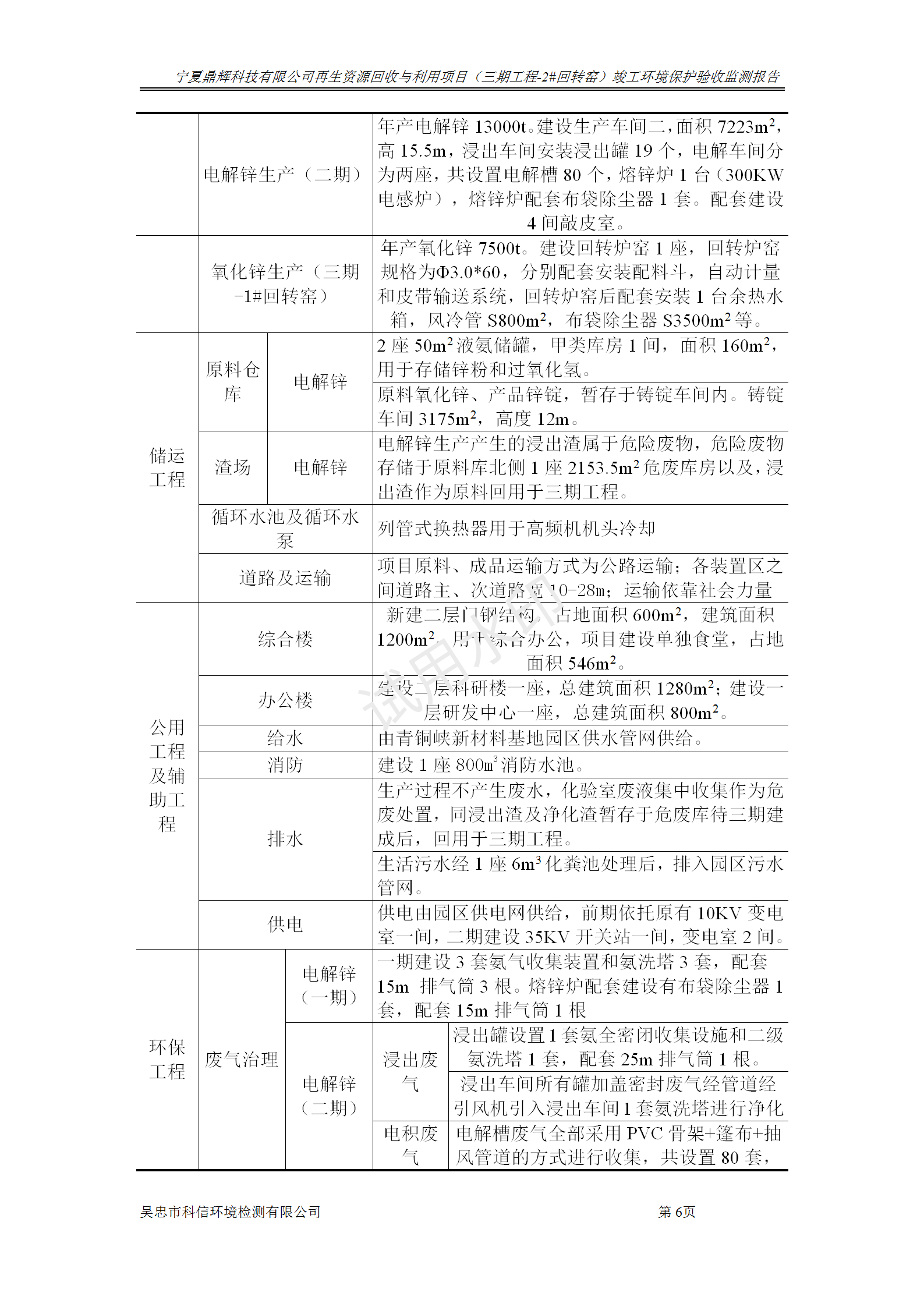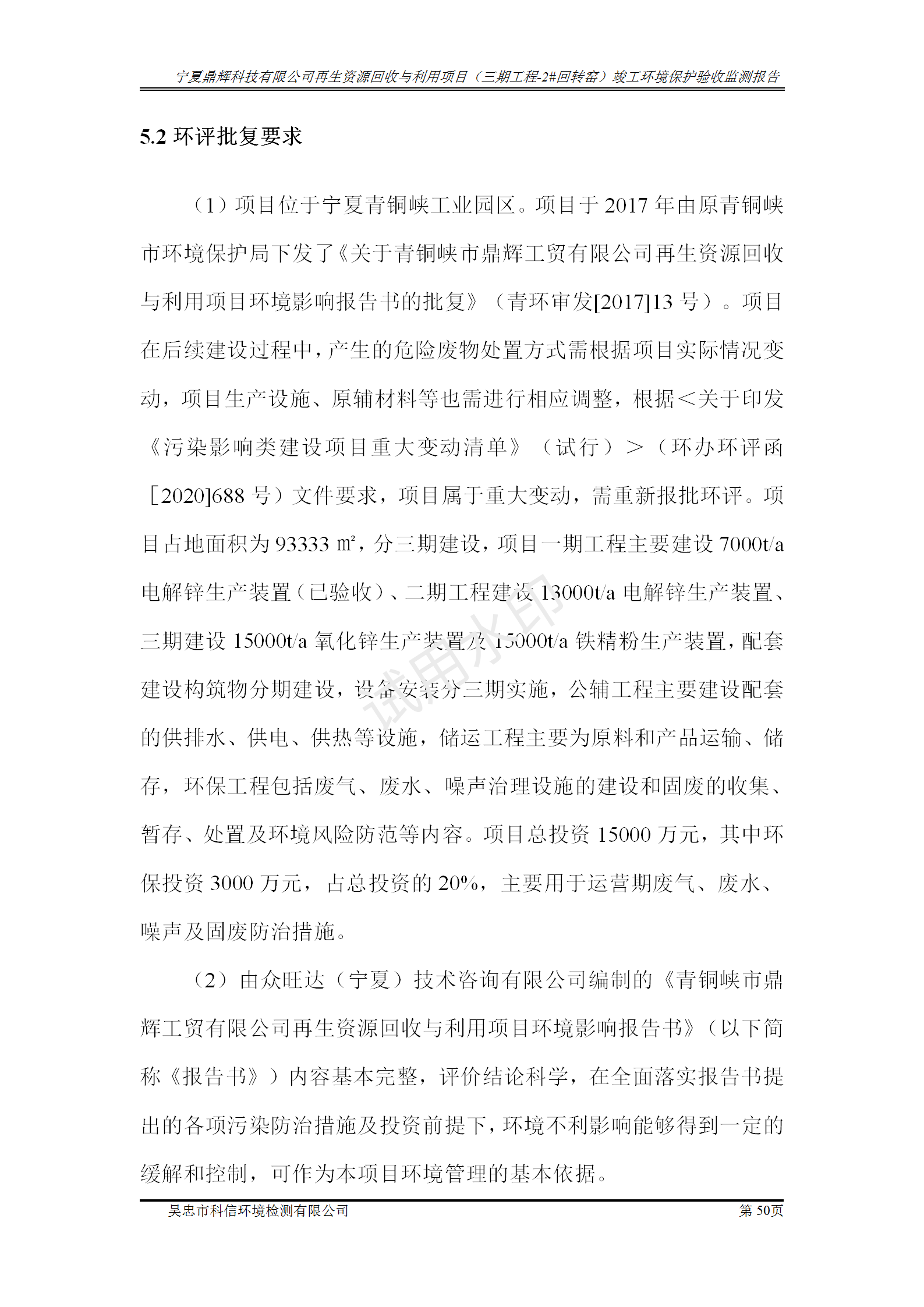 項目分三期建設,一期建設年產(chǎn)7000噸、二期建設年產(chǎn)13000噸、三期建設年產(chǎn)7500噸電解鋅及配套建設氨洗塔、危廢暫存間等,已通過(guò)環(huán)??⒐を炇?。項目在后續建設過(guò)程中,產(chǎn)生的危險廢物處置方式根據項目實(shí)際情況變動(dòng),建設單位對項目浸出渣及凈化渣進(jìn)行回收利用,并對氧化鋅生產(chǎn)設備進(jìn)行調整。相應的生產(chǎn)設施、原輔材料等也需進(jìn)行相應調整,屬于重大變動(dòng)。按照《環(huán)評法》規定需要重新報批環(huán)評。為此,企業(yè)委托寧夏(眾旺達)技術(shù)咨詢(xún)有限公司2021年1月編制完成《青銅峽市鼎輝工貿有限公司再生資源回收與利用項目環(huán)境影響報告書(shū)》,并于2021年3月取得吳忠市生態(tài)環(huán)境局《關(guān)于青銅峽市鼎輝工貿有限公司再生資源回收與利用項目環(huán)境影響報告書(shū)的批復》吳環(huán)審[2021]14號。