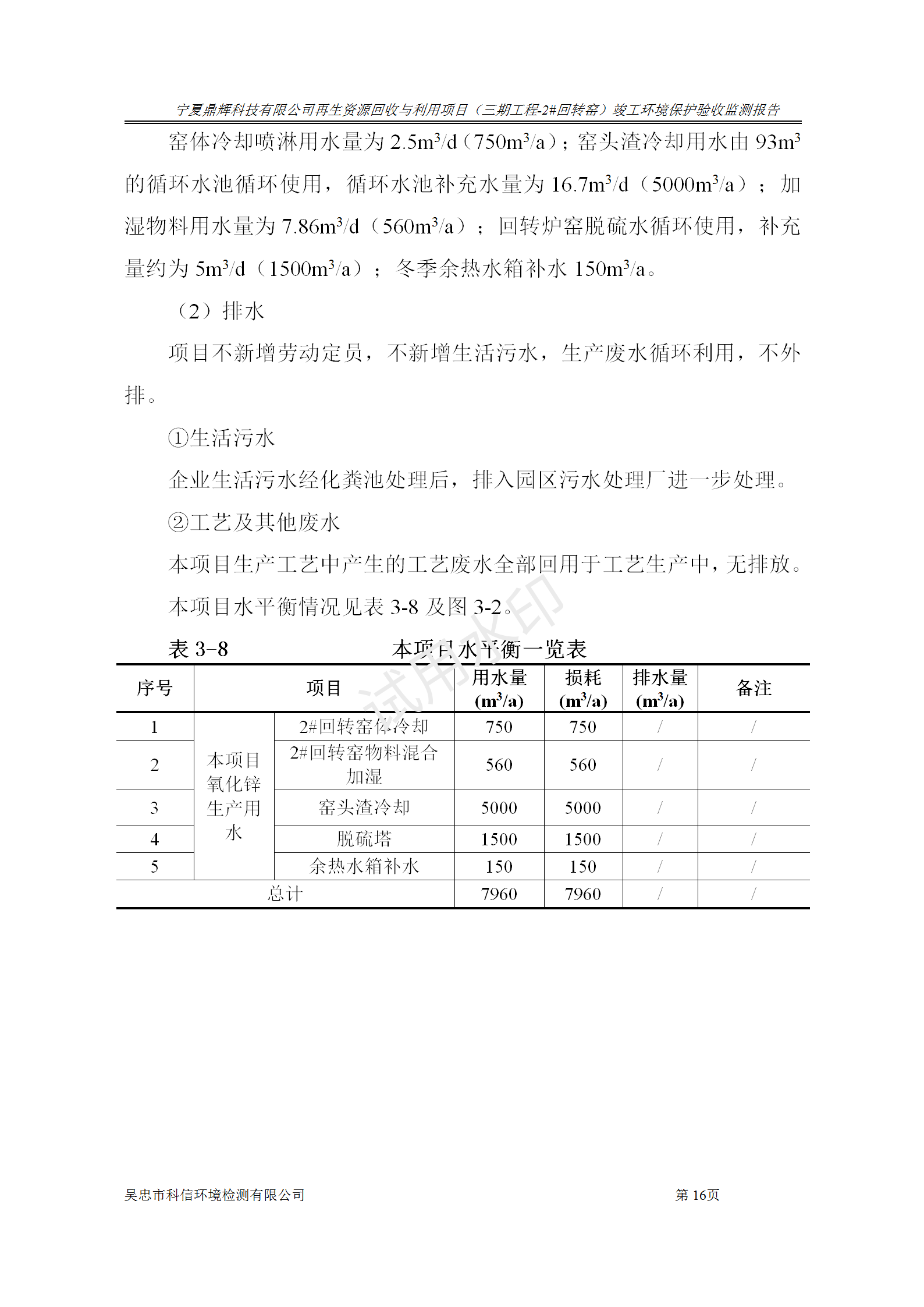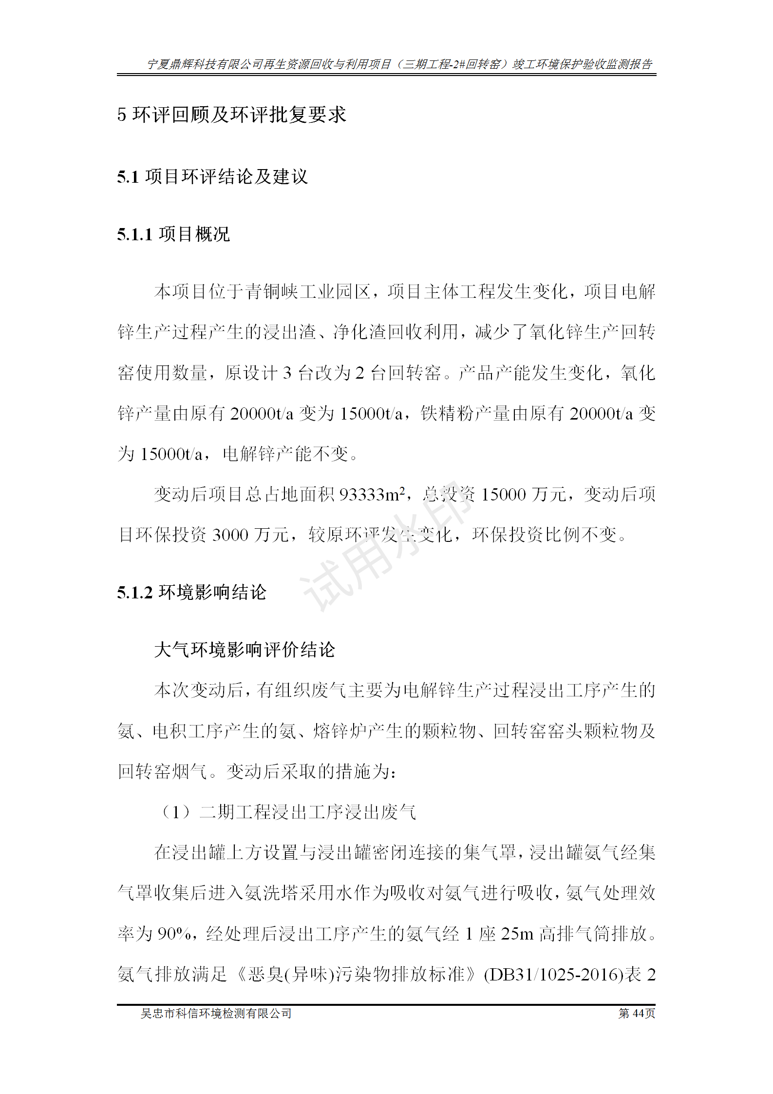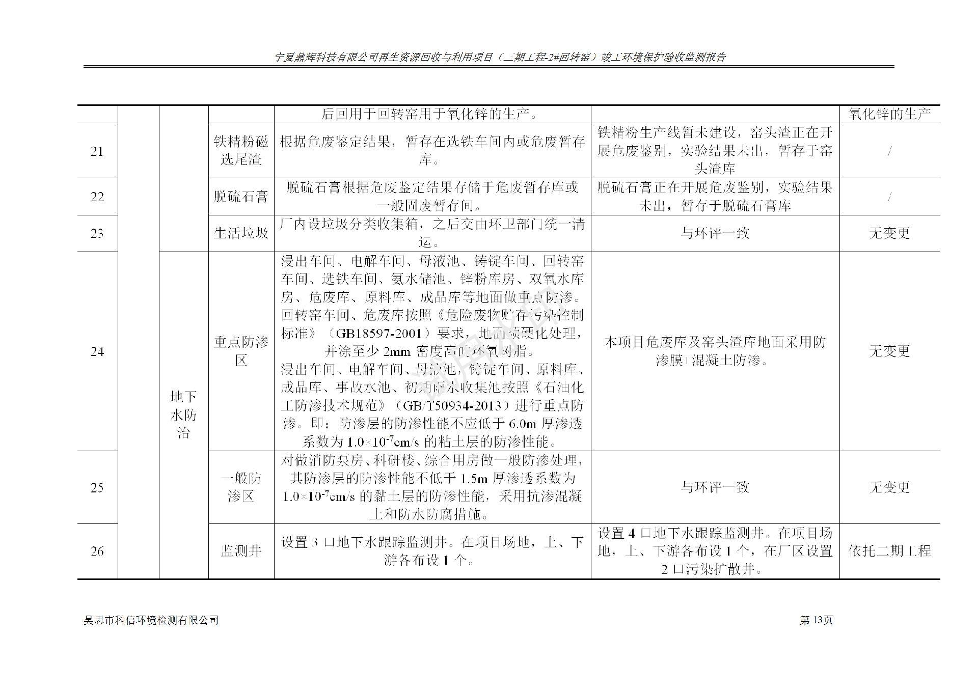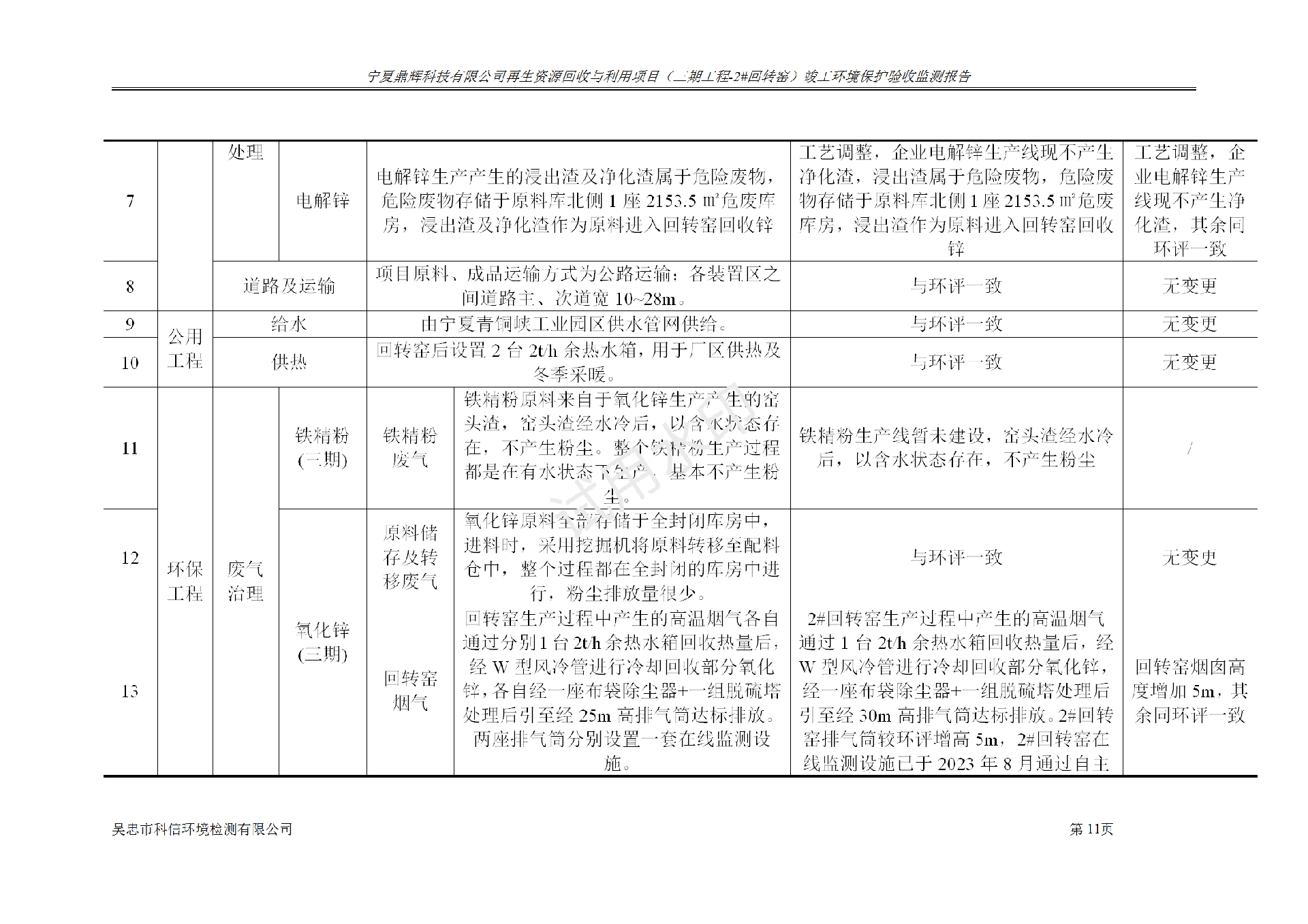 項目分三期建設,一期建設年產(chǎn)7000噸、二期建設年產(chǎn)13000噸、三期建設年產(chǎn)7500噸電解鋅及配套建設氨洗塔、危廢暫存間等,已通過(guò)環(huán)??⒐を炇?。項目在后續建設過(guò)程中,產(chǎn)生的危險廢物處置方式根據項目實(shí)際情況變動(dòng),建設單位對項目浸出渣及凈化渣進(jìn)行回收利用,并對氧化鋅生產(chǎn)設備進(jìn)行調整。相應的生產(chǎn)設施、原輔材料等也需進(jìn)行相應調整,屬于重大變動(dòng)。按照《環(huán)評法》規定需要重新報批環(huán)評。為此,企業(yè)委托寧夏(眾旺達)技術(shù)咨詢(xún)有限公司2021年1月編制完成《青銅峽市鼎輝工貿有限公司再生資源回收與利用項目環(huán)境影響報告書(shū)》,并于2021年3月取得吳忠市生態(tài)環(huán)境局《關(guān)于青銅峽市鼎輝工貿有限公司再生資源回收與利用項目環(huán)境影響報告書(shū)的批復》吳環(huán)審[2021]14號。