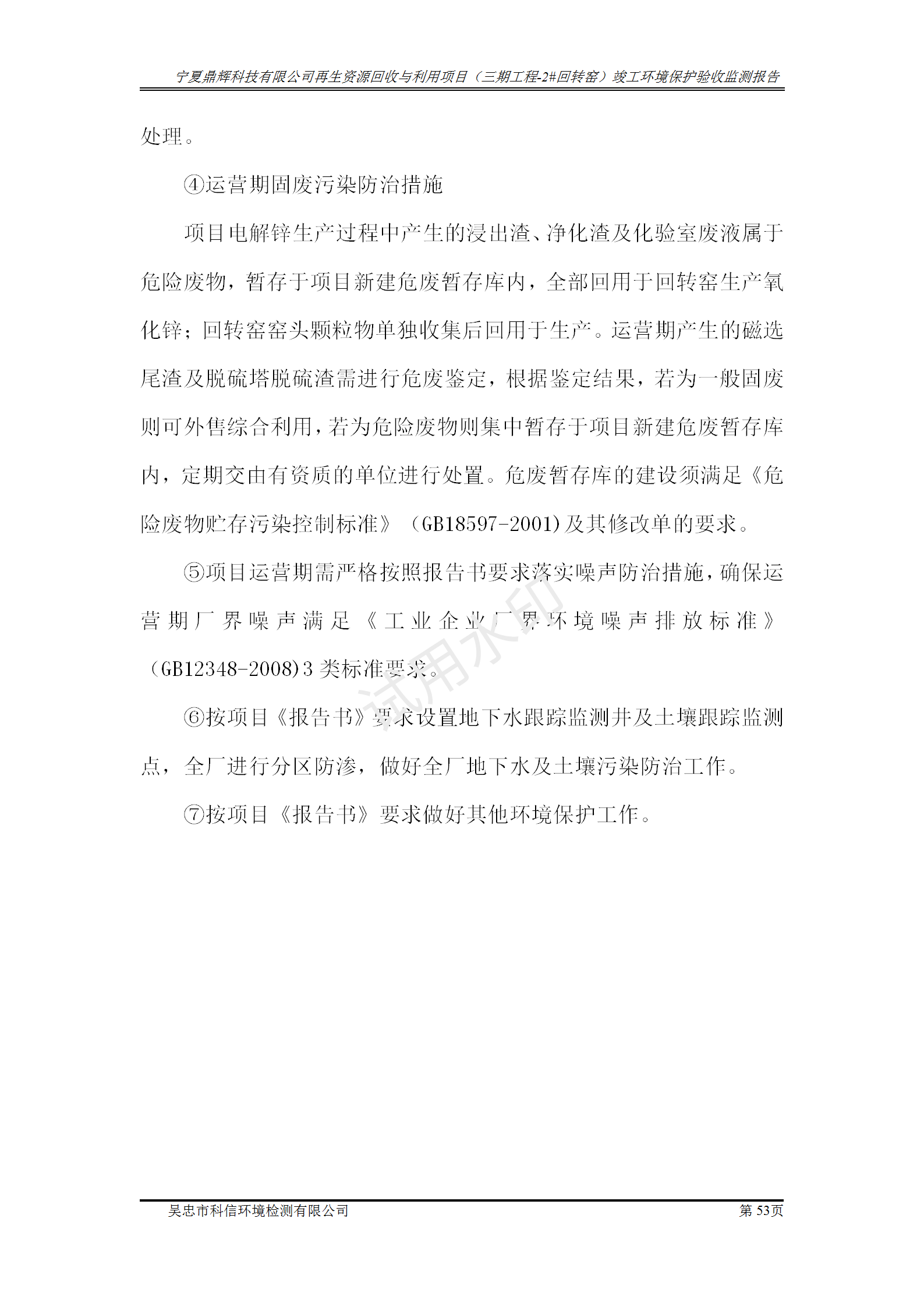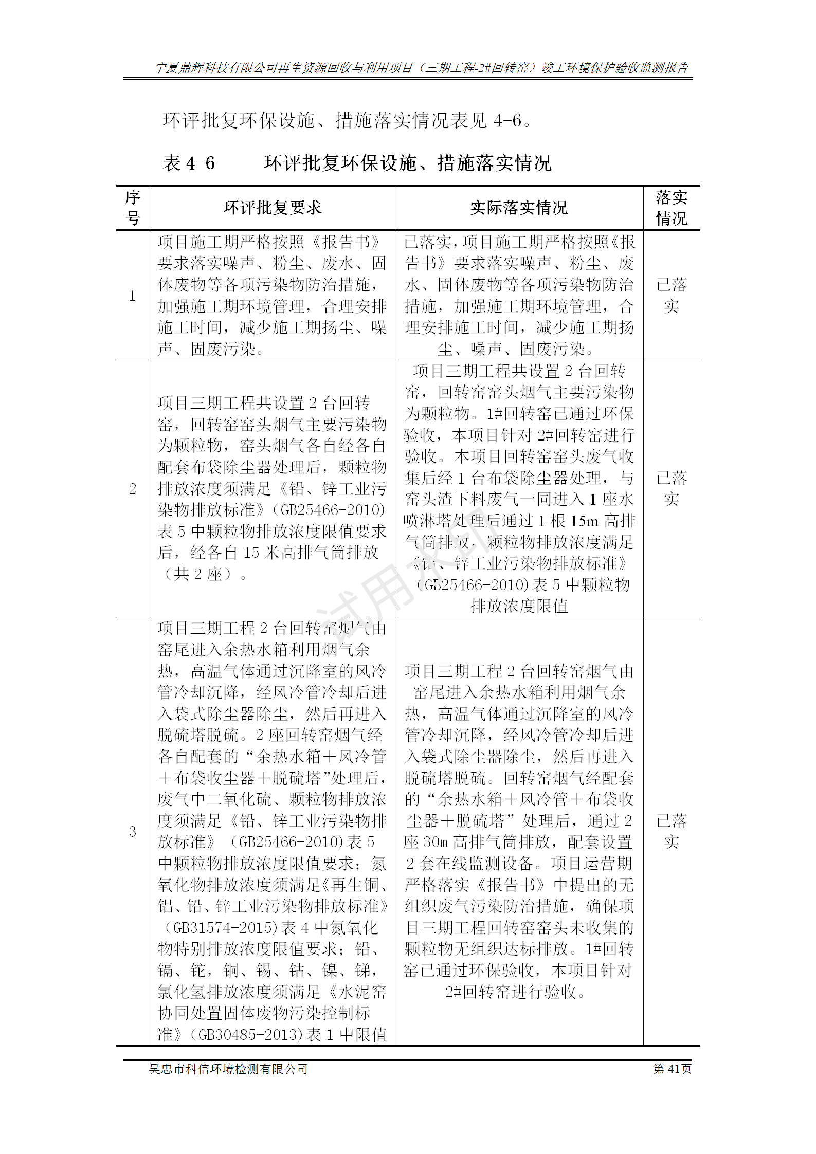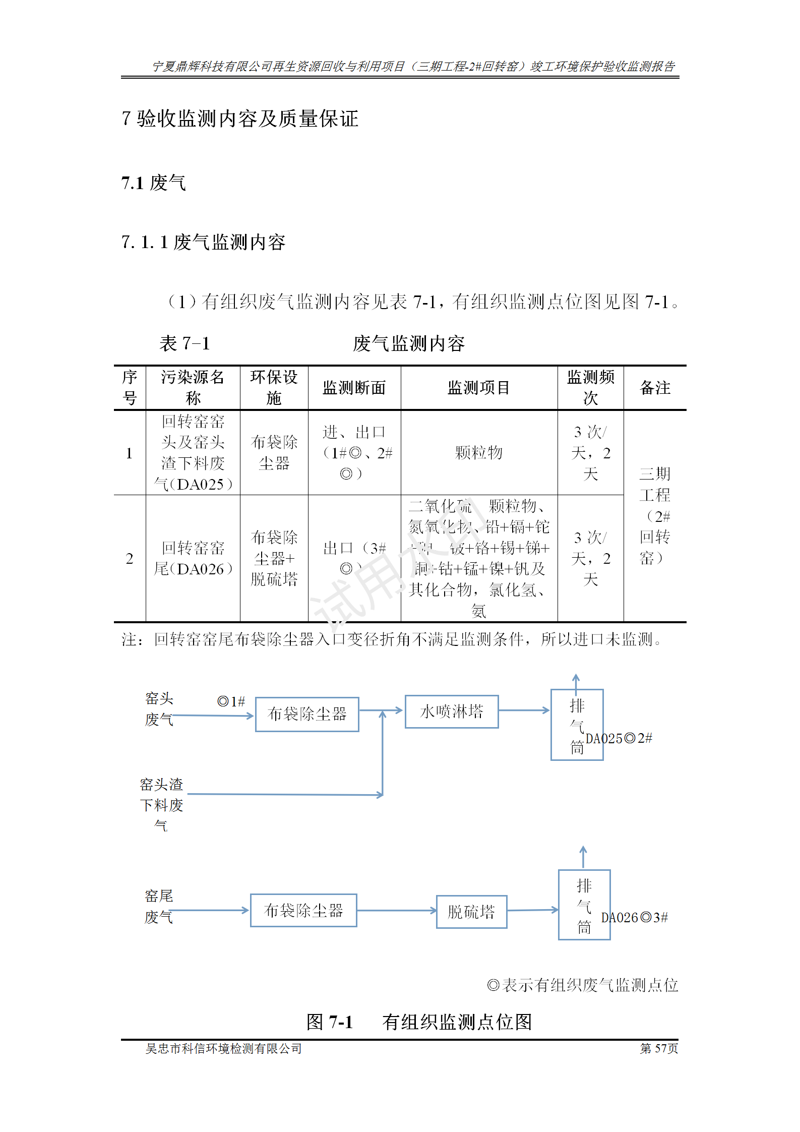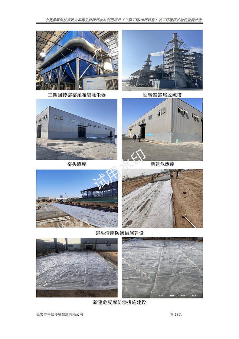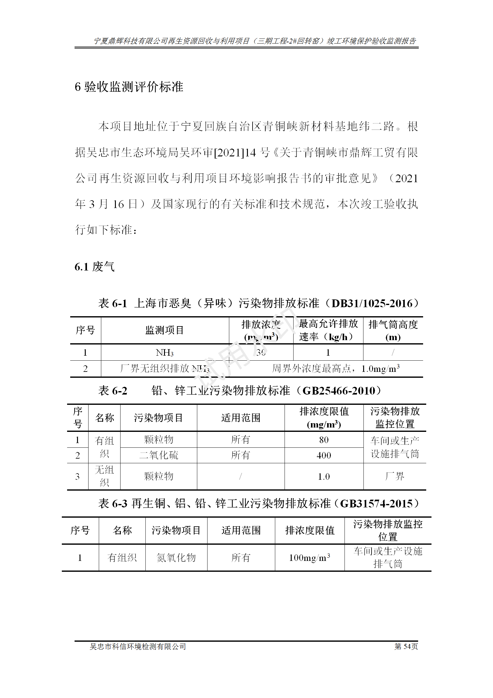 2024年7月5日,寧夏鼎輝科技有限公司(原名青銅峽市鼎輝工貿有限公司)按照環(huán)境保護部《建設項目竣工環(huán)境保護驗收暫行辦法(試行)》(國環(huán)規環(huán)評〔2017〕4號)組織對青銅峽市鼎輝工貿有限公司再生資源回收與利用項目(三期工程-2#回轉窯)進(jìn)行竣工環(huán)境保護驗收。驗收組由項目建設單位(寧夏鼎輝科技有限公司)、驗收監測單位(吳忠市科信環(huán)境檢測有限公司)及特邀3名專(zhuān)家組成。驗收組聽(tīng)取了青銅峽市鼎輝工貿有限公司再生資源回收與利用項目(三期工程-2#回轉窯)建設及環(huán)保設施建設運行情況的匯報,聽(tīng)取了驗收監測單位驗收監測情況的匯報,現場(chǎng)檢查了環(huán)保設施建設運行情況,審查核實(shí)了相關(guān)資料,經(jīng)討論、評議,形成如下驗收意見(jiàn):