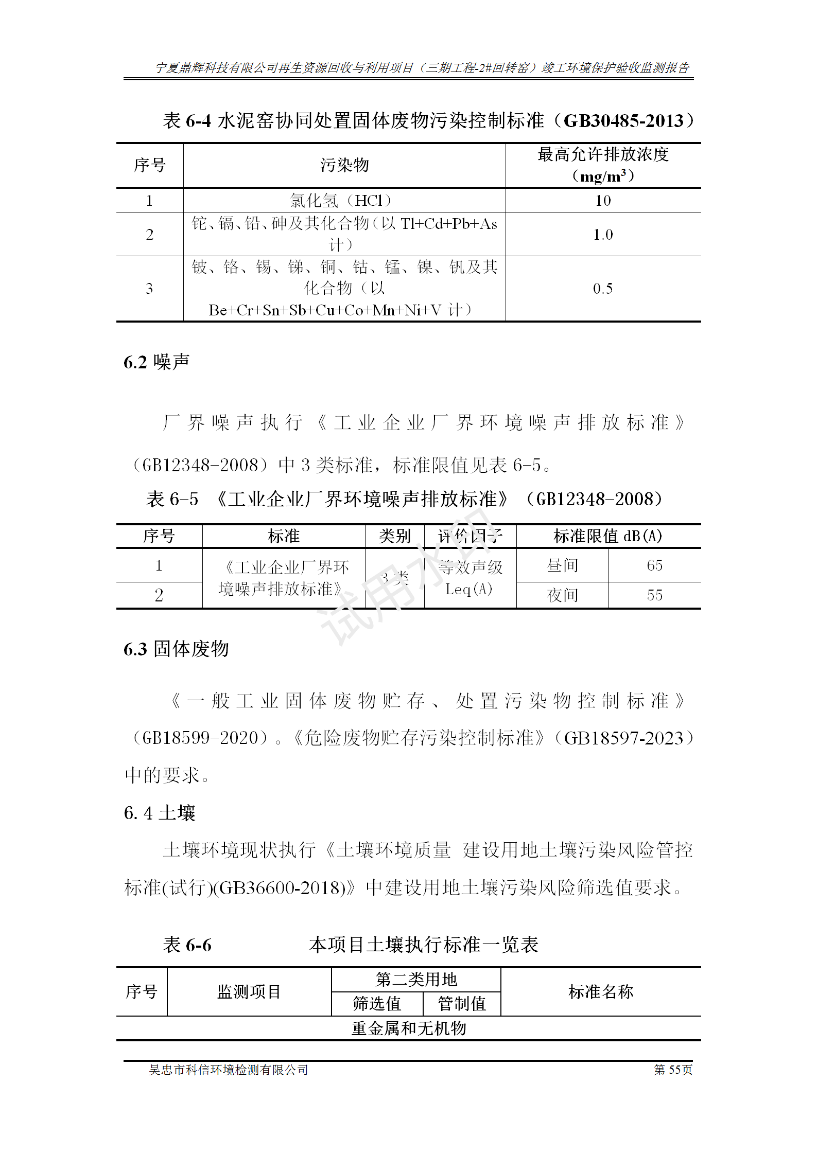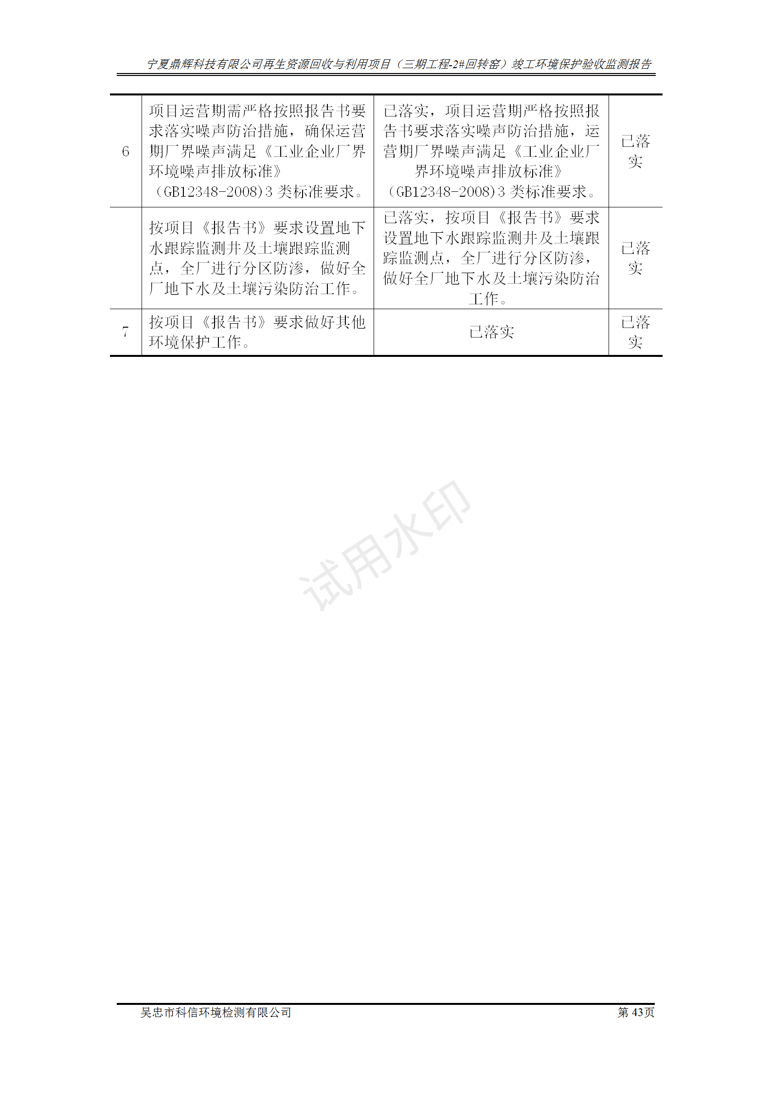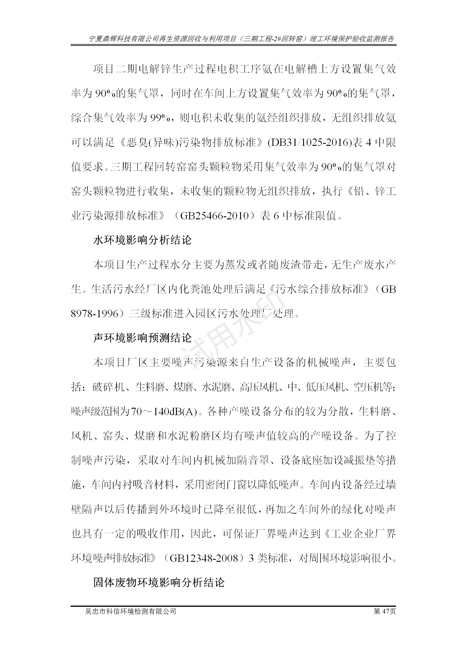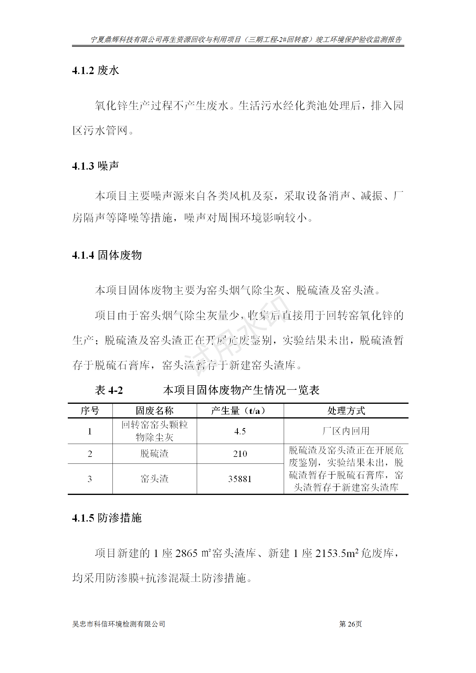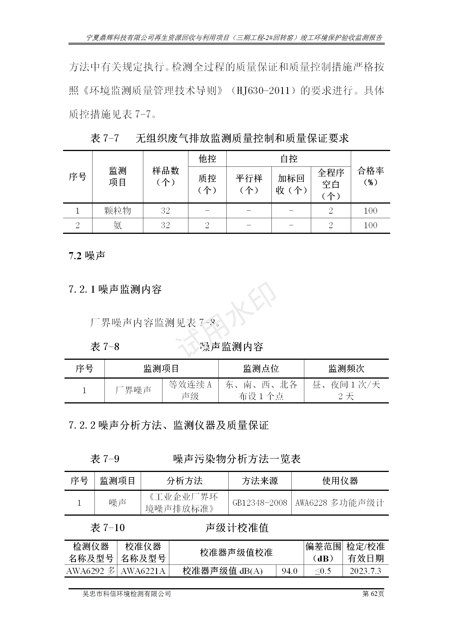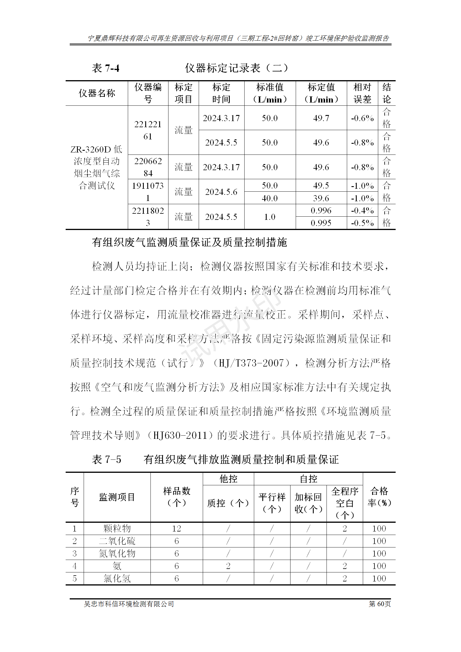 2024年7月5日,寧夏鼎輝科技有限公司(原名青銅峽市鼎輝工貿有限公司)按照環(huán)境保護部《建設項目竣工環(huán)境保護驗收暫行辦法(試行)》(國環(huán)規環(huán)評〔2017〕4號)組織對青銅峽市鼎輝工貿有限公司再生資源回收與利用項目(三期工程-2#回轉窯)進(jìn)行竣工環(huán)境保護驗收。驗收組由項目建設單位(寧夏鼎輝科技有限公司)、驗收監測單位(吳忠市科信環(huán)境檢測有限公司)及特邀3名專(zhuān)家組成。驗收組聽(tīng)取了青銅峽市鼎輝工貿有限公司再生資源回收與利用項目(三期工程-2#回轉窯)建設及環(huán)保設施建設運行情況的匯報,聽(tīng)取了驗收監測單位驗收監測情況的匯報,現場(chǎng)檢查了環(huán)保設施建設運行情況,審查核實(shí)了相關(guān)資料,經(jīng)討論、評議,形成如下驗收意見(jiàn):