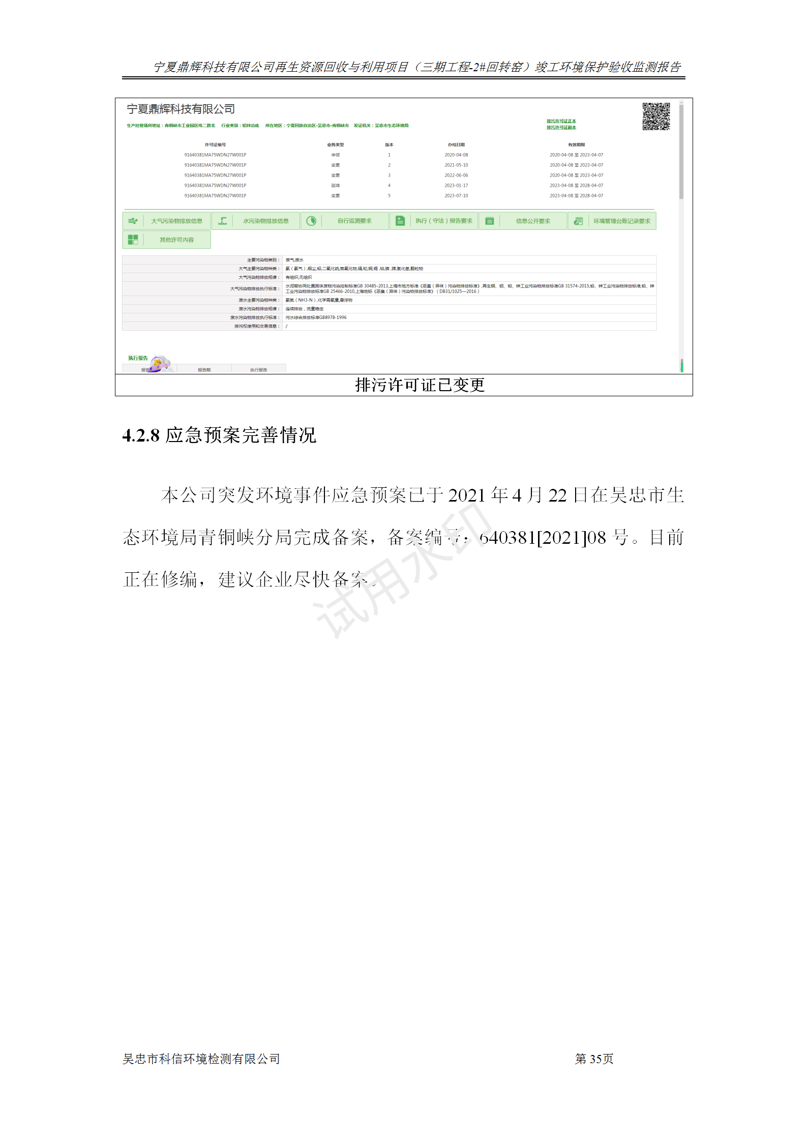 寧夏鼎輝科技有限公司排污許可證已在“全國排污許可證管理信息平臺”進(jìn)行固定污染源排污登記,登記編號:91640381MA75WDN27W001P,有效期為2023年4月8日至2028年4月7日。本項目排污口已于2023年1月17日變更,本項目排污口已納入排污許可證。公司已編制并備案了突發(fā)環(huán)境事件應急預案。環(huán)境管理機構健全,制度完善,企業(yè)制定了自行監測方案并委托第三方開(kāi)展自行監測。
