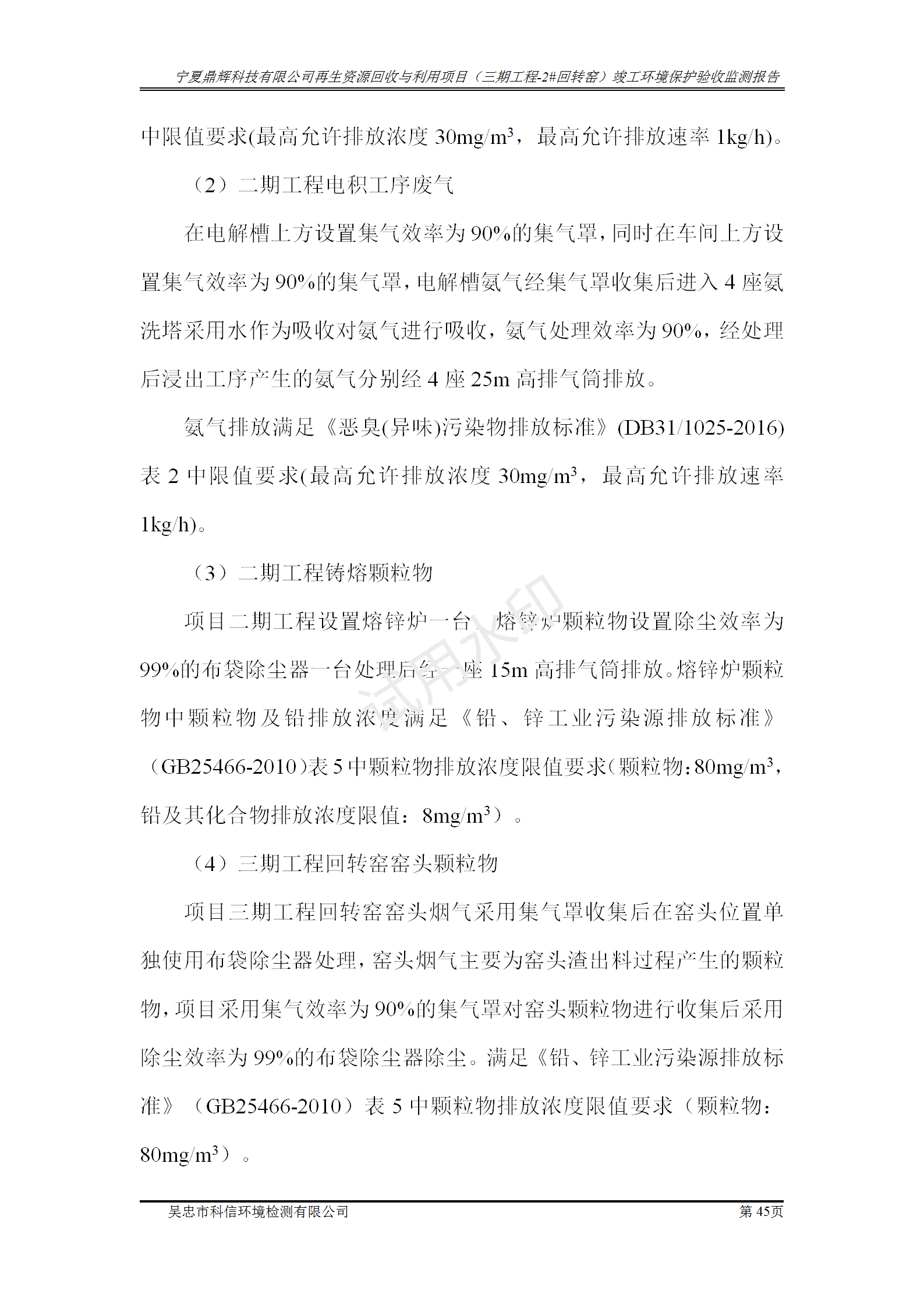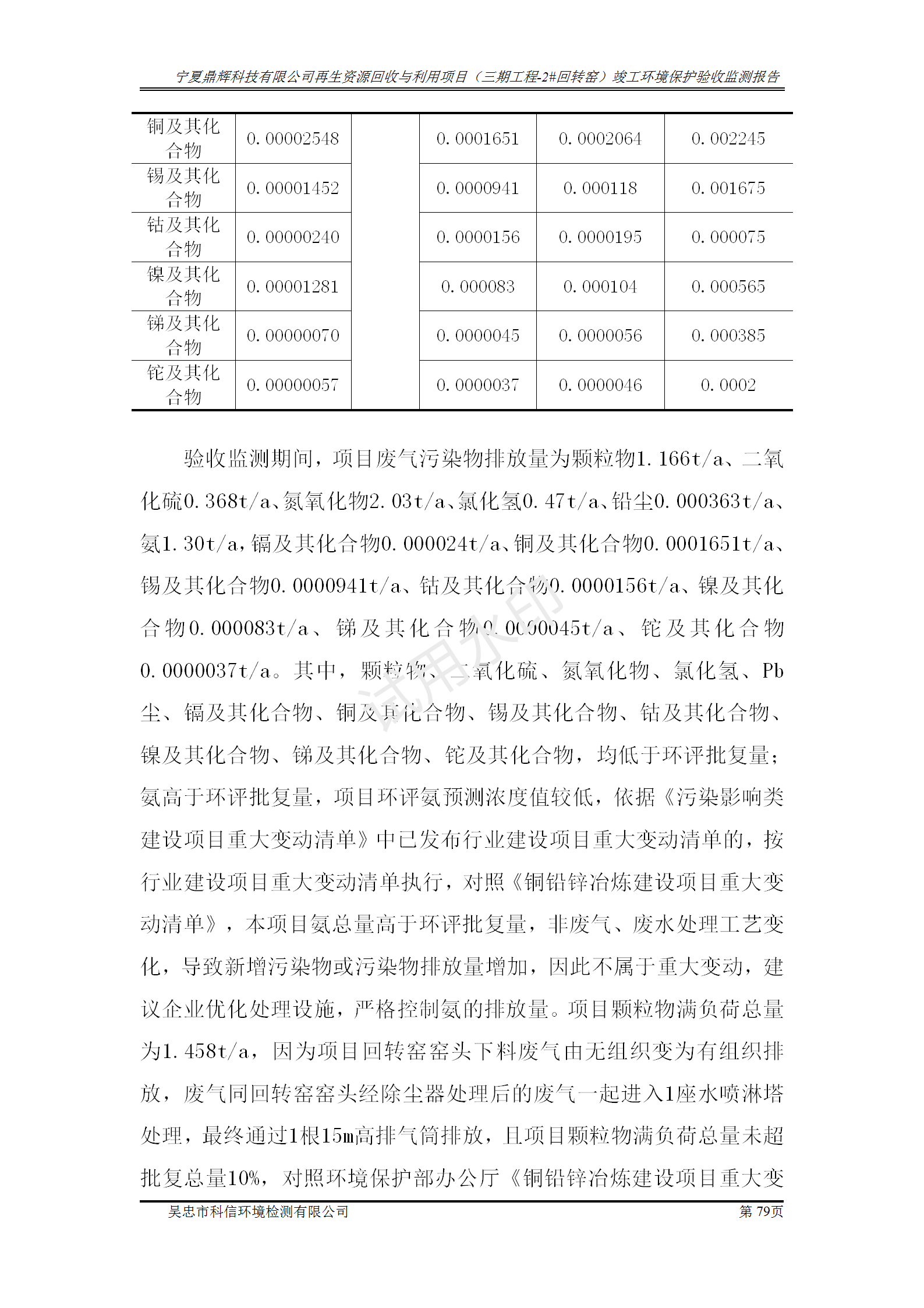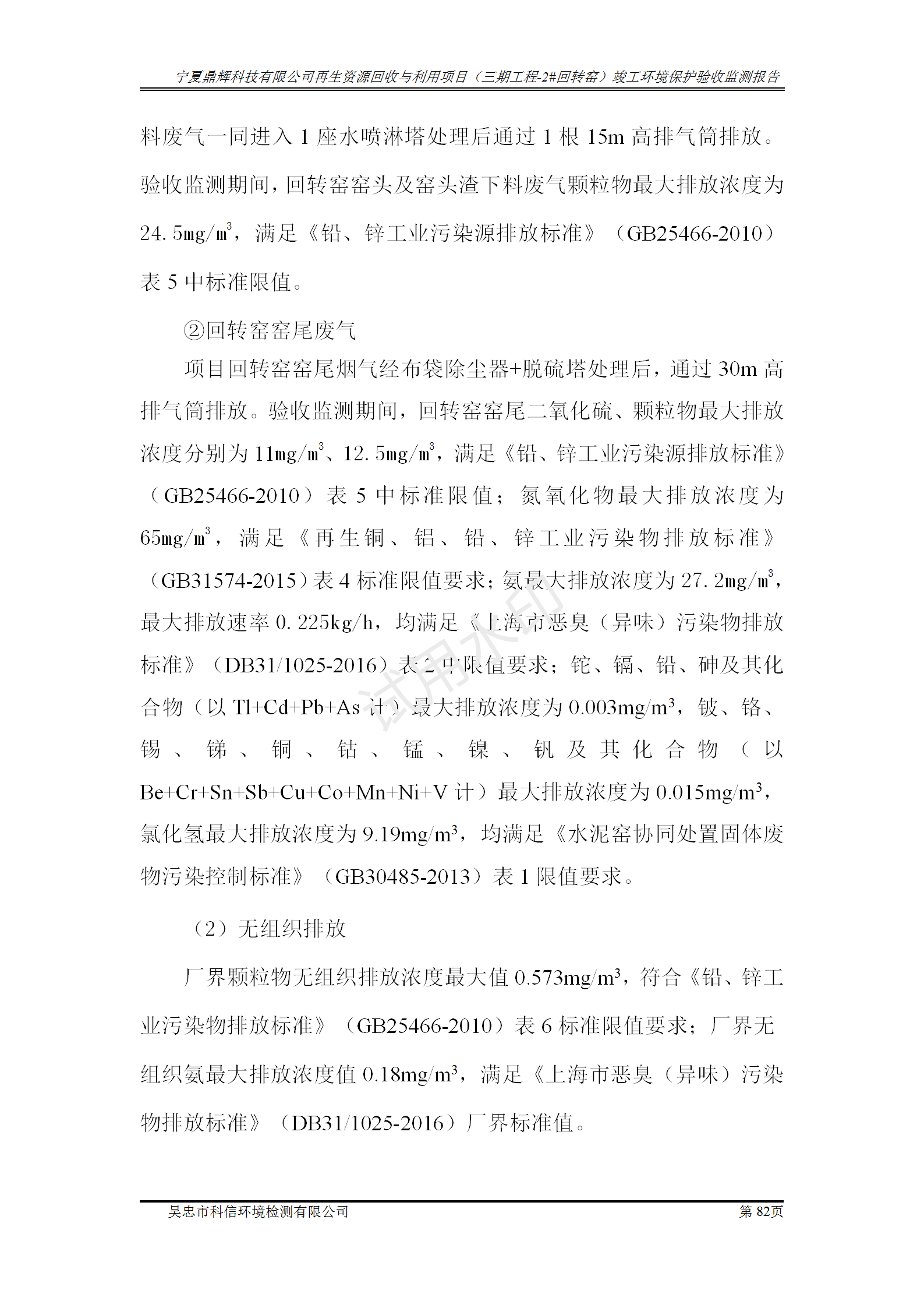 2、回轉窯窯尾二氧化硫、顆粒物*大排放濃度分別為11mg/m3、12.5mg/m3,滿(mǎn)足《鉛、鋅工業(yè)污染源排放標準》(GB25466-2010)表5中標準限值;氮氧化物*大排放濃度為65mg/m3,滿(mǎn)足《再生銅、鋁、鉛、鋅工業(yè)污染物排放標準》(GB31574-2015)表4標準限值要求;氨*大排放濃度為27.2mg/m3,*大排放速率0.225kg/h,均滿(mǎn)足《上海市惡臭(異味)污染物排放標準》(DB31/1025-2016)表2中限值要求;鉈、鎘、鉛、砷及其化合物(以Tl+Cd+Pb+As計)*大排放濃度為0.003mg/m3,鈹、鉻、錫、銻、銅、鈷、錳、鎳、釩及其化合物(以Be+Cr+Sn+Sb+Cu+Co+Mn+Ni+V計)*大排放濃度為0.015mg/m3,氯化氫*大排放濃度為9.19mg/m3,均滿(mǎn)足《水泥窯協(xié)同處置固體廢物污染控制標準》(GB30485-2013)表1限值要求。
