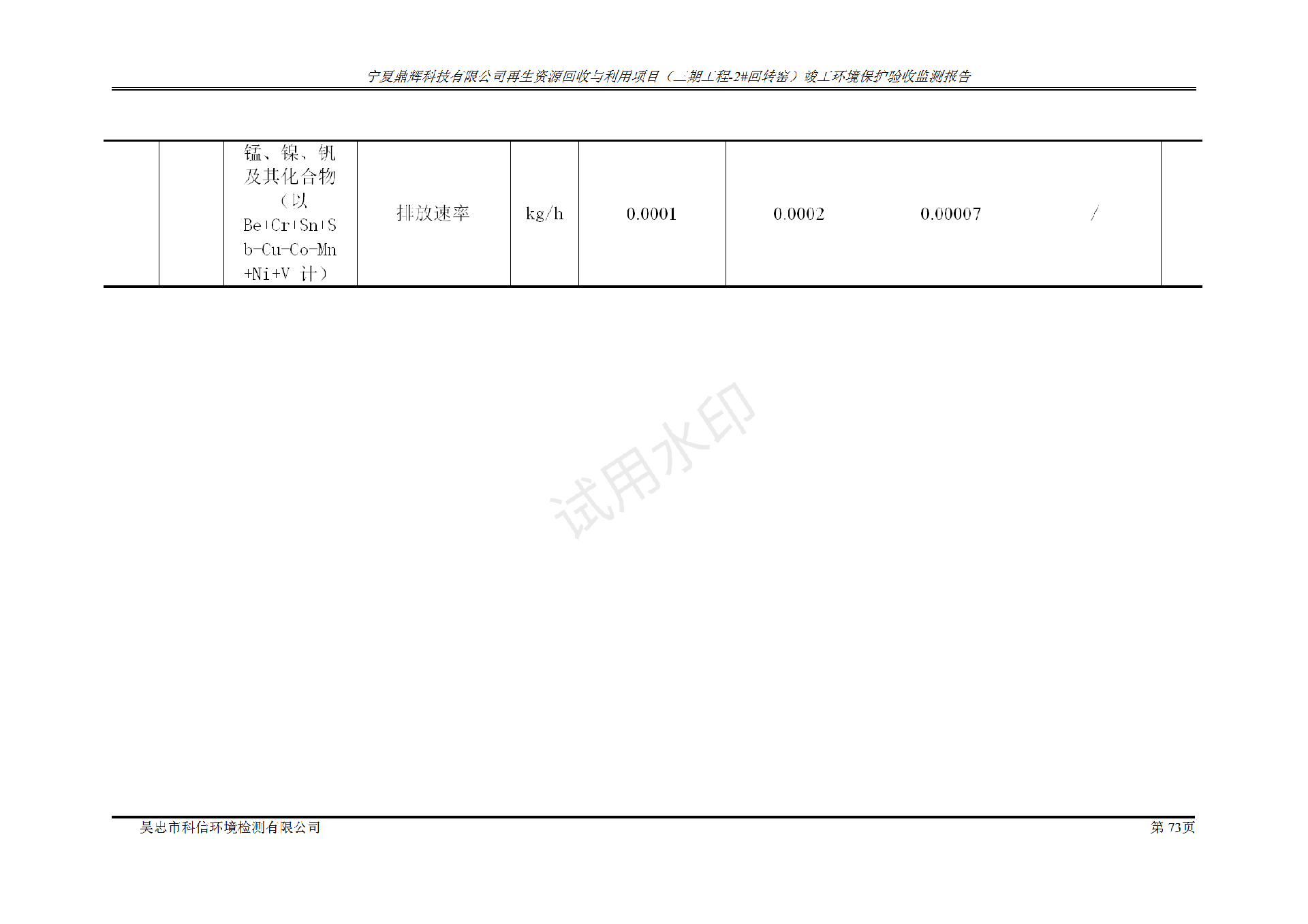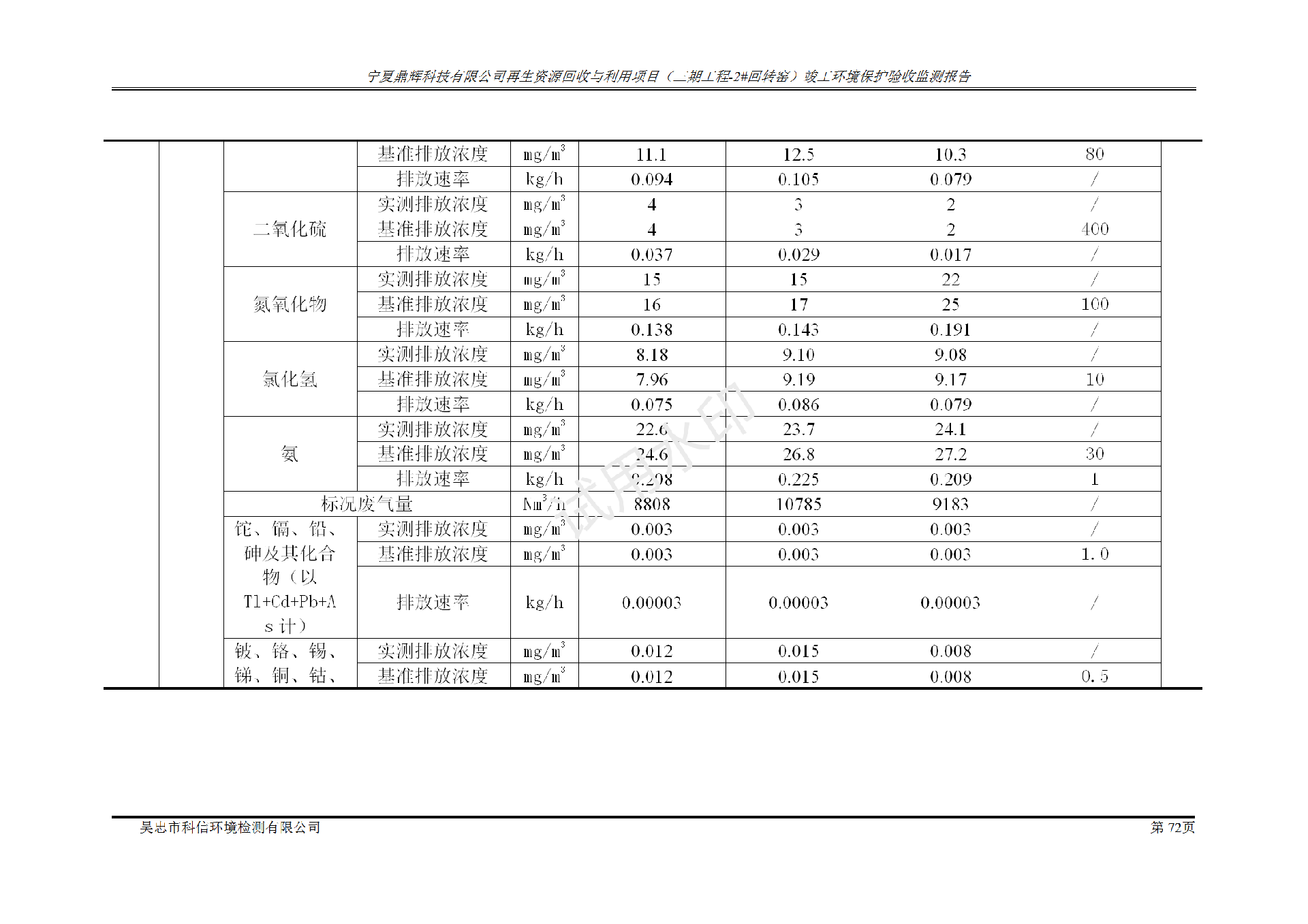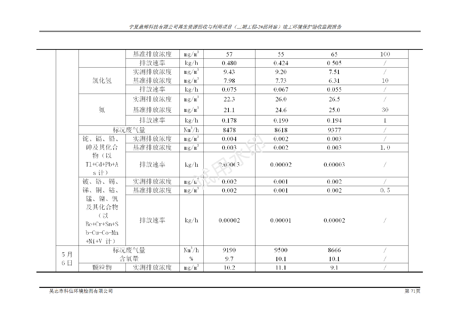 2、回轉窯窯尾二氧化硫、顆粒物*大排放濃度分別為11mg/m3、12.5mg/m3,滿(mǎn)足《鉛、鋅工業(yè)污染源排放標準》(GB25466-2010)表5中標準限值;氮氧化物*大排放濃度為65mg/m3,滿(mǎn)足《再生銅、鋁、鉛、鋅工業(yè)污染物排放標準》(GB31574-2015)表4標準限值要求;氨*大排放濃度為27.2mg/m3,*大排放速率0.225kg/h,均滿(mǎn)足《上海市惡臭(異味)污染物排放標準》(DB31/1025-2016)表2中限值要求;鉈、鎘、鉛、砷及其化合物(以Tl+Cd+Pb+As計)*大排放濃度為0.003mg/m3,鈹、鉻、錫、銻、銅、鈷、錳、鎳、釩及其化合物(以Be+Cr+Sn+Sb+Cu+Co+Mn+Ni+V計)*大排放濃度為0.015mg/m3,氯化氫*大排放濃度為9.19mg/m3,均滿(mǎn)足《水泥窯協(xié)同處置固體廢物污染控制標準》(GB30485-2013)表1限值要求。